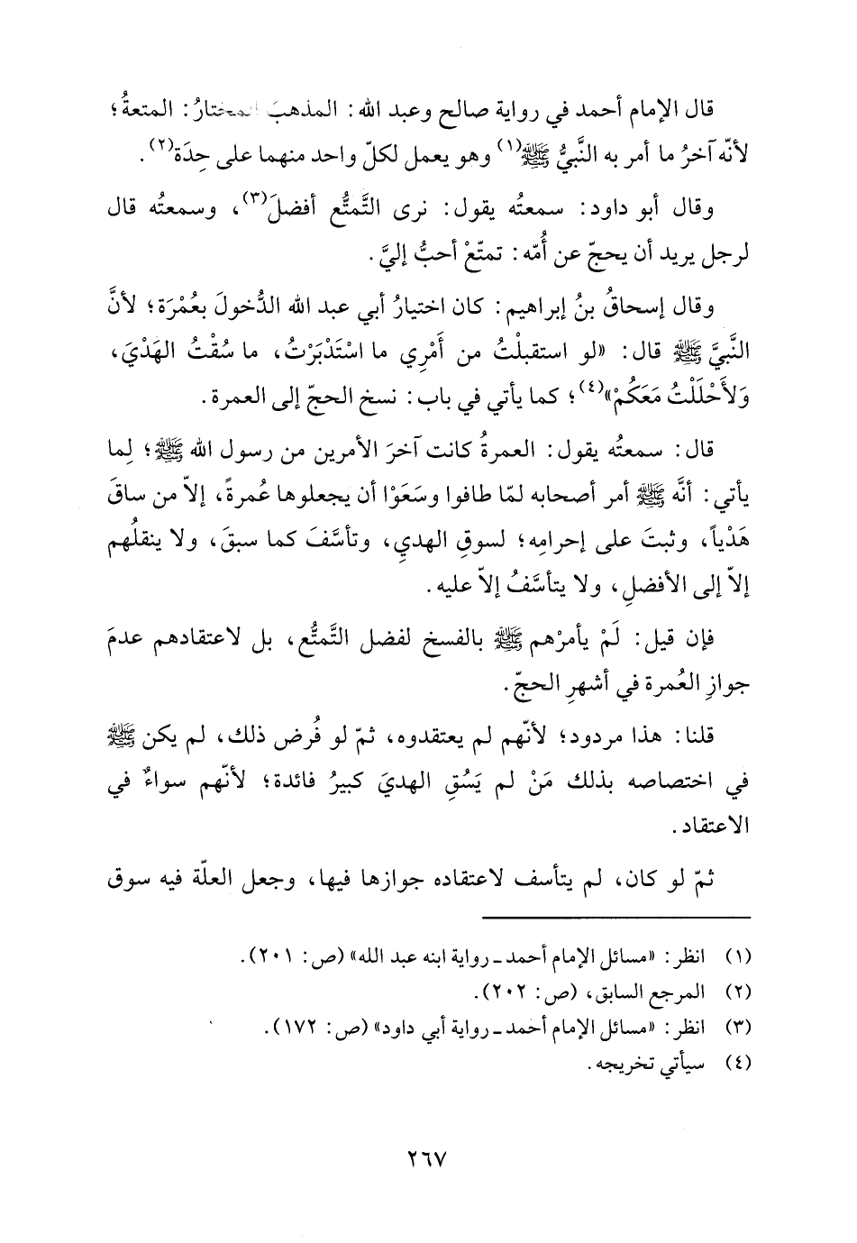 وقال أبو داود: سمعتُه يقول: نرى التَّمتُّع أفضلَ (٣)، وسمعتُه قال لرجل يريد أن يحجّ عن أُمّه: تمتّعْ أحبُّ إليَّ.
