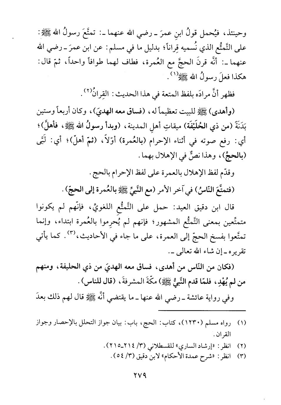 قال ابن دقيق العيد: حمل على التَّمتُّعِ اللغويِّ، فإنّهم لم يكونوا متمتِّعين بمعنى التَّمتُّع المشهور؛ فإنهم لم يُحرِموا بالعُمرة ابتداء، وإنما تمتَّعوا بفسخ الحجّ إلى العمرة، على ما جاء في الأحاديث، (٣). كما يأتي تقريره -إن شاء اللَّه تعالى-.