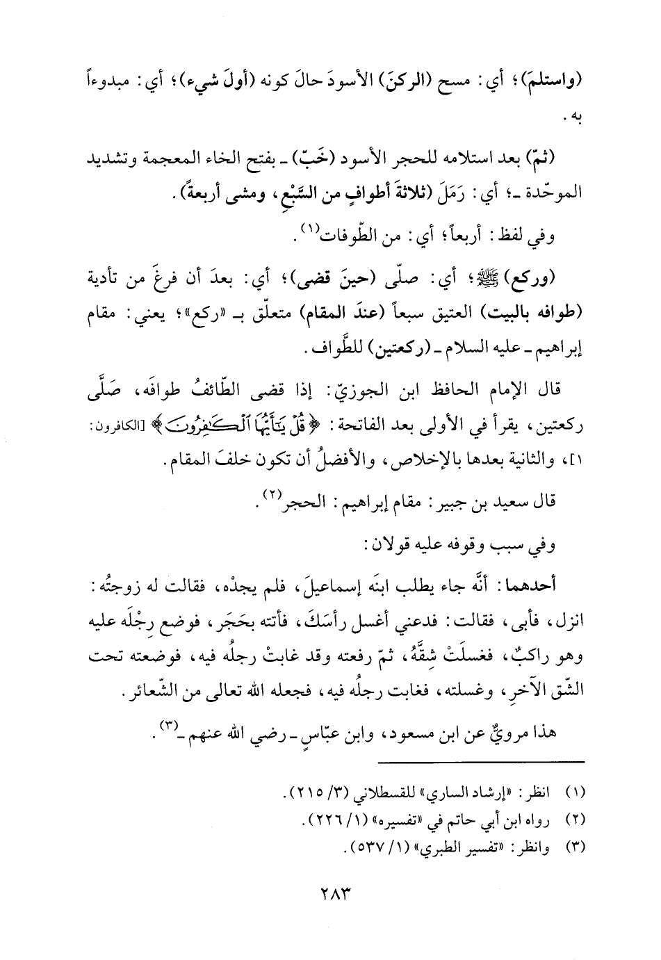 قال الإمام الحافظ ابن الجوزيّ: إذا قضى الطّائفُ طوافَه، صَلَّى ركعتين، يقرأ في الأولى بعد الفاتحة: {قُلْ يَاأَيُّهَا الْكَافِرُونَ} [الكافرون: ١]، والثانية بعدها بالإخلاص، والأفضلُ أن تكون خلفَ المقام.