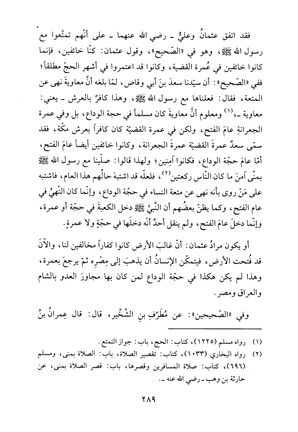 أو يكون مرادُ عثمان: أنّ غالبَ الأرض كانوا كفارًا مخالفين لنا، والآنَ قد فُتحت الأرض، فيتمكّن الإنسانُ أن يذهبَ إلى مِصرِه ثمّ يرجعَ بعمرة، وهذا لم يكن هكذا في حجّة الوداع لمن كان بها مجاورَ العدو بالشام والعراق ومصر.