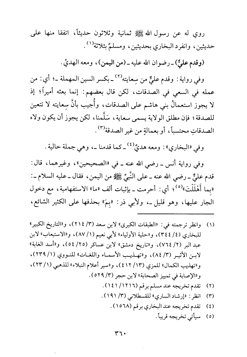 وفي رواية أنس - رضي الله عنه - في "الصحيحين"، وغيرهما، قال: قدم عليٌّ - رضي الله عنه - على النَّبيِّ - صلى الله عليه وسلم - من اليمن، فقال -عليه السلام-: "بِما أَهْلَلْتَ" (٥)؛ أي: أحرمت -بإثبات ألف "ما" الاستفهامية، مع دخول الجار عليها، وهو قليل-، ولأبي ذر: "بِمَ" بحذفها على الكثير الشائع،