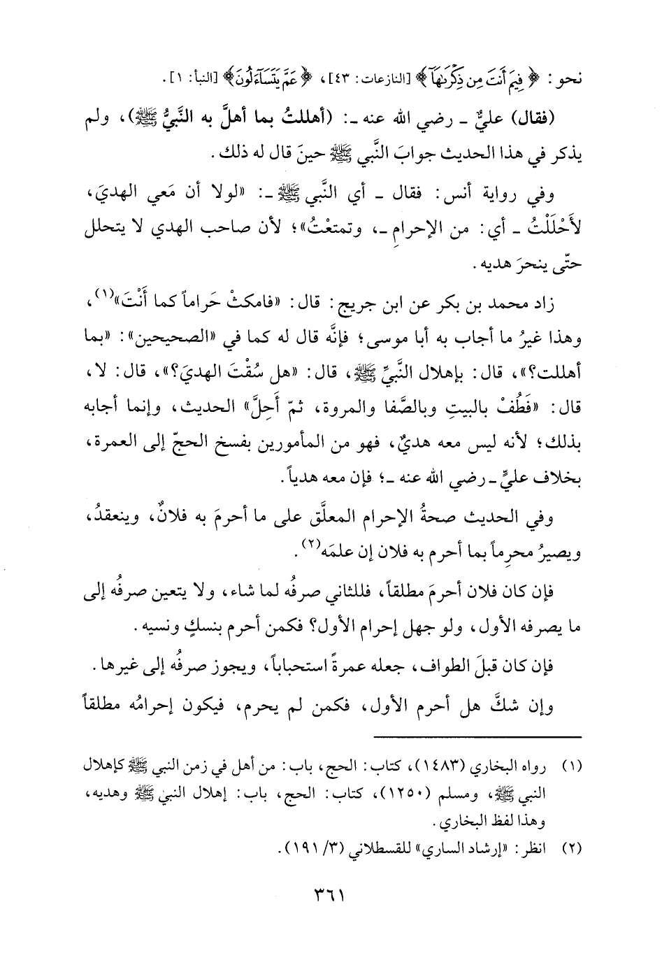 وفي رواية أنس: فقال -أي النَّبي - صلى الله عليه وسلم -: "لولا أن مَعي الهديَ، لأَحْلَلْتُ -أي: من الإحرامِ-، وتمتعْتُ"؛ لأن صاحب الهدي لا يتحلل حتّى ينحرَ هديه.
