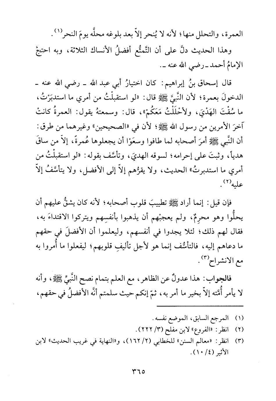 قال إسحاق بنُ إبراهيم: كان اختيارُ أبي عبد الله - رضي الله عنه - الدخولَ بعمرة؛ لأن النبي - صلى الله عليه وسلم - قال: "لو استقبلْتُ من أمري ما استدبَرْتُ، ما سُقْتَ الهَدْيَ، ولأحْلَلْتُ مَعَكُمْ"، قال: وسمعتهُ يقول: العمرةُ كانتْ آخرَ الأمرين من رسول الله - صلى الله عليه وسلم -؛ لأن في "الصحيحين" وغيرهما من طرق: أن النَّبي - صلى الله عليه وسلم - أمرَ أصحابه لما طافوا وسعَوْا أن يجعلوها عُمرةً، إلّا من ساقَ هديًا، وثبتَ على إحرامه، لسوقه الهديَ، وتأسَّف بقوله: "لو استقبلْتُ من أمري ما استدبرتُ" الحديث، ولا يقرُّهم إلّا إلى الأفضل، ولا يتأسَّفُ إلّا عليه (٢).