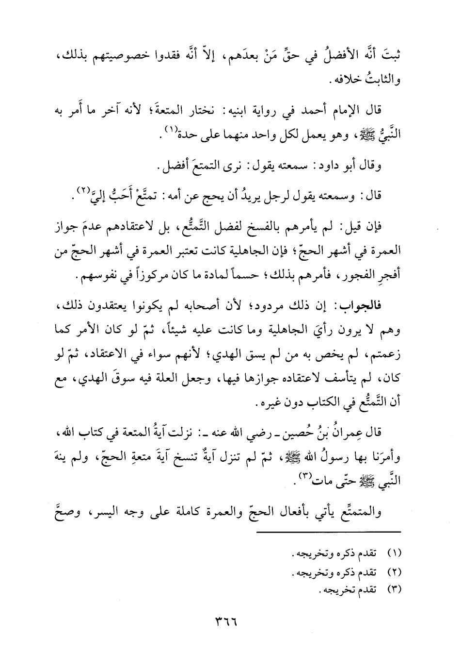 قال الإمام أحمد في رواية ابنيه: نختار المتعةَ؛ لأنه آخر ما أَمر به النَّبيُّ - صلى الله عليه وسلم -، وهو يعمل لكل واحد منهما على حدة (١).