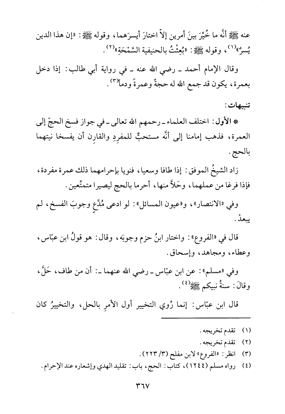 * الأول: اختلف العلماء -رحمهم الله تعالى- في جواز فسخ الحجّ إلى العمرة، فذهب إمامنا إلى أنَّه مستحبٌّ للمفرِدِ والقارِن أن يفسخا نيتهما بالحج.