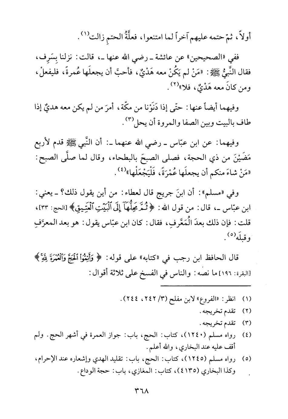 قال الحافظ ابن رجب في "كتابه" على قوله: {وَأَتِمُّوا الْحَجَّ وَالْعُمْرَةَ لِلَّهِ} [البقرة: ١٩٦] ما نصه: والناس في الفسخ على ثلاثة أقوال: