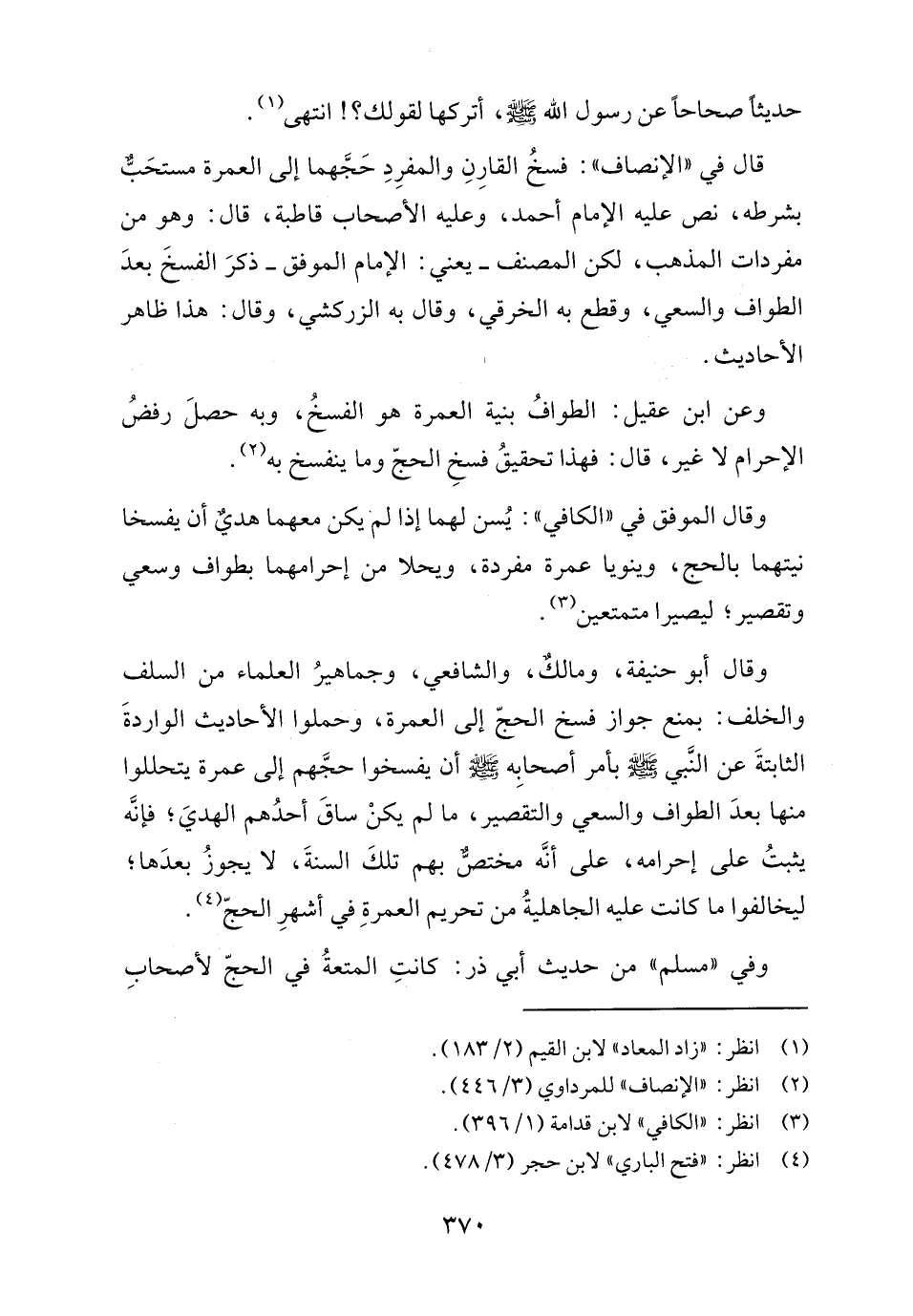 قالى في "الإنصاف": فسخُ القارِنِ والمفرِدِ حَجَّهما إلى العمرة مستحَبٌّ بشرطه، نص عليه الإمام أحمد، وعليه الأصحاب قاطبة، قال: وهو من مفردات المذهب، لكن المصنف -يعني: الإمام الموفق- ذكرَ الفسخَ بعدَ الطواف والسعي، وقطع به الخرقي، وقال به الزركشي، وقال: هذا ظاهر الأحاديث.