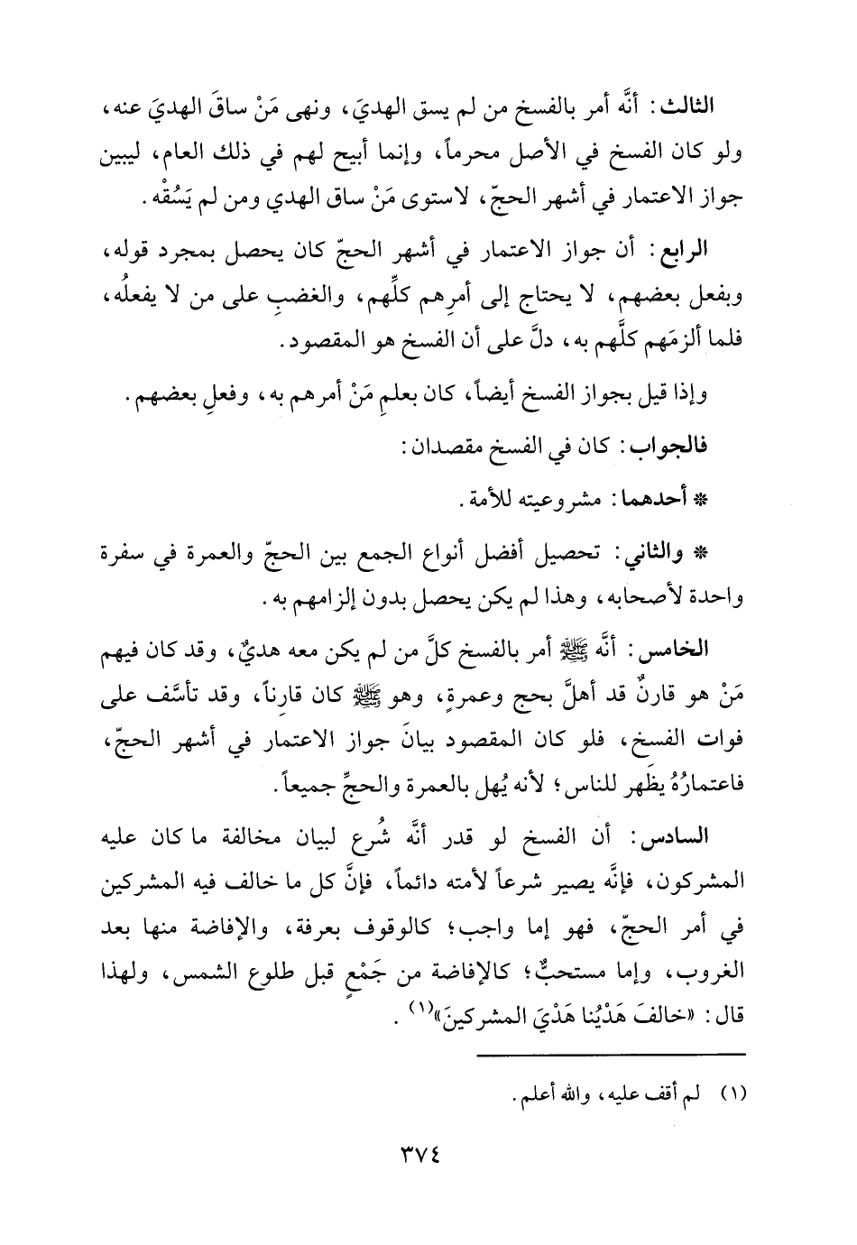 السادس: أن الفسخ لو قدر أنَّه شُرع لبيان مخالفة ما كان عليه المشركون، فإنَّه يصير شرعًا لأمته دائما، فإنَّ كل ما خالف فيه المشركين في أمر الحجّ، فهو إما واجب، كالوقوف بعرفة، والإفاضة منها بعد الغروب، وإما مستحبٌّ، كالإفاضة من جَمْعٍ قبل طلوع الشمس، ولهذا قال: "خالفَ هَدْيُنا هَدْيَ المشركينَ" (١).