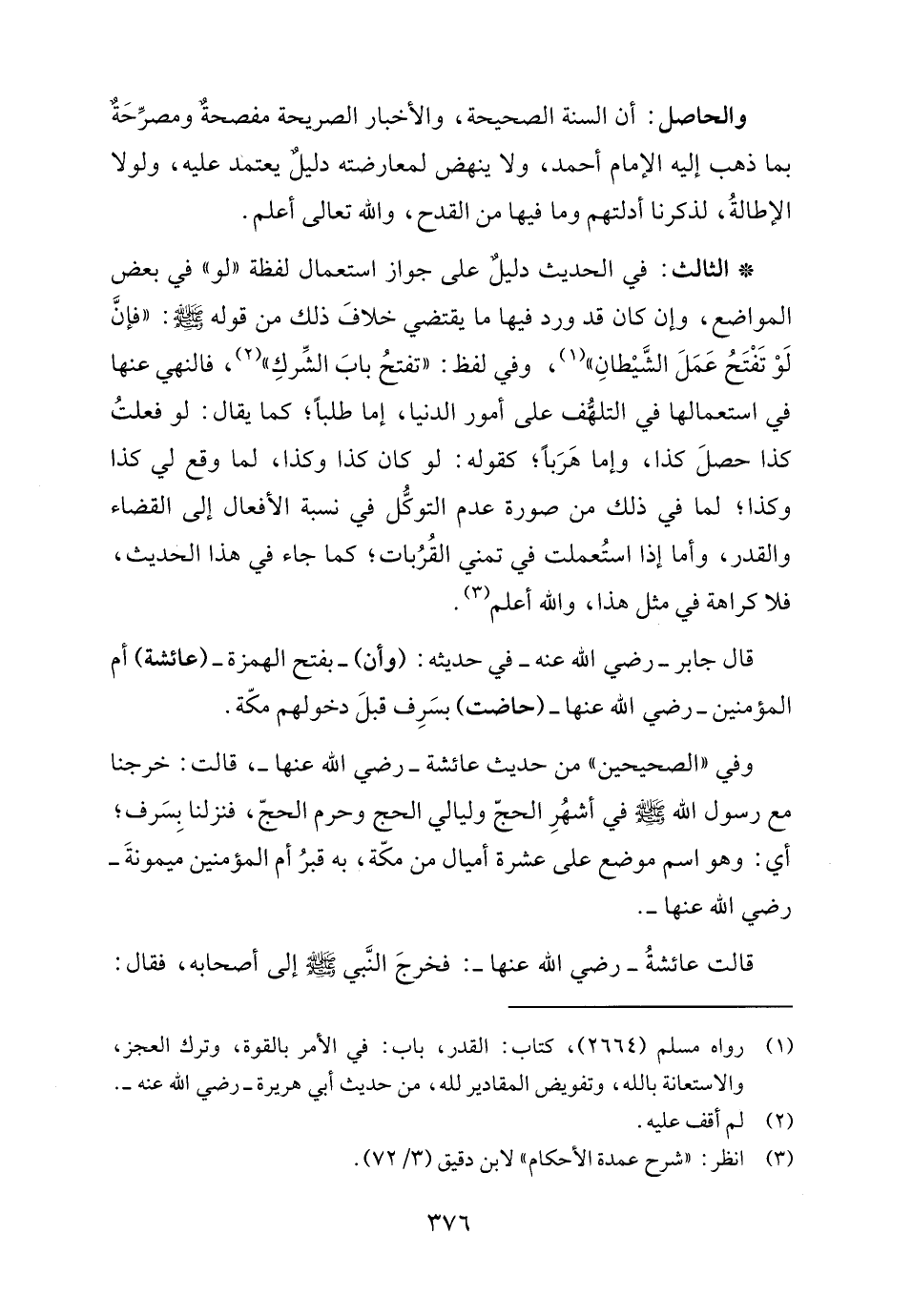 والحاصل: أن السنة الصحيحة، والأخبار الصريحة مفصحةٌ ومصرِّحَةٌ بما ذهب إليه الإمام أحمد، ولا ينهض لمعارضته دليلٌ يعتمد عليه، ولولا الإطالةُ، لذكرنا أدلتهم وما فيها من القدح، والله تعالى أعلم.