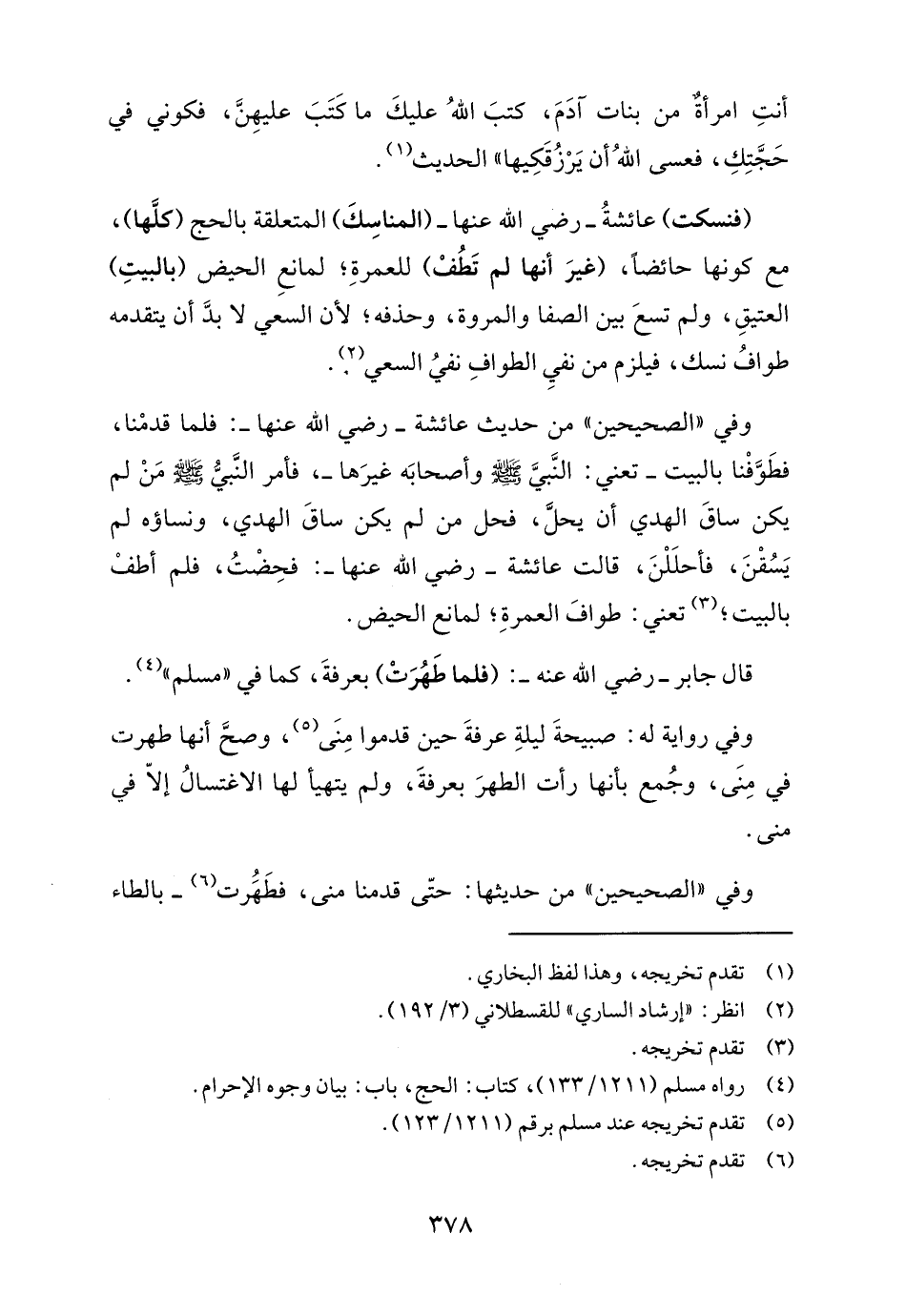 وفي "الصحيحين" من حديث عائشة - رضي الله عنها -: فلما قدمْنا، فطَوَّفْنا بالبيت -تعني: النَّبيَّ - صلى الله عليه وسلم - وأصحابَه غيرَها-، فأمر النَّبيُّ - صلى الله عليه وسلم - مَنْ لم يكن ساقَ الهدي أن يحلَّ، فحل من لم يكن ساقَ الهدي، ونساؤه لم يَسُقْنَ، فأحلَلْنَ، قالت عائشة - رضي الله عنها -: فحِضْتُ، فلم أطفْ بالبيت، (٣) تعني: طوافَ العمرةِ، لمانع الحيض.