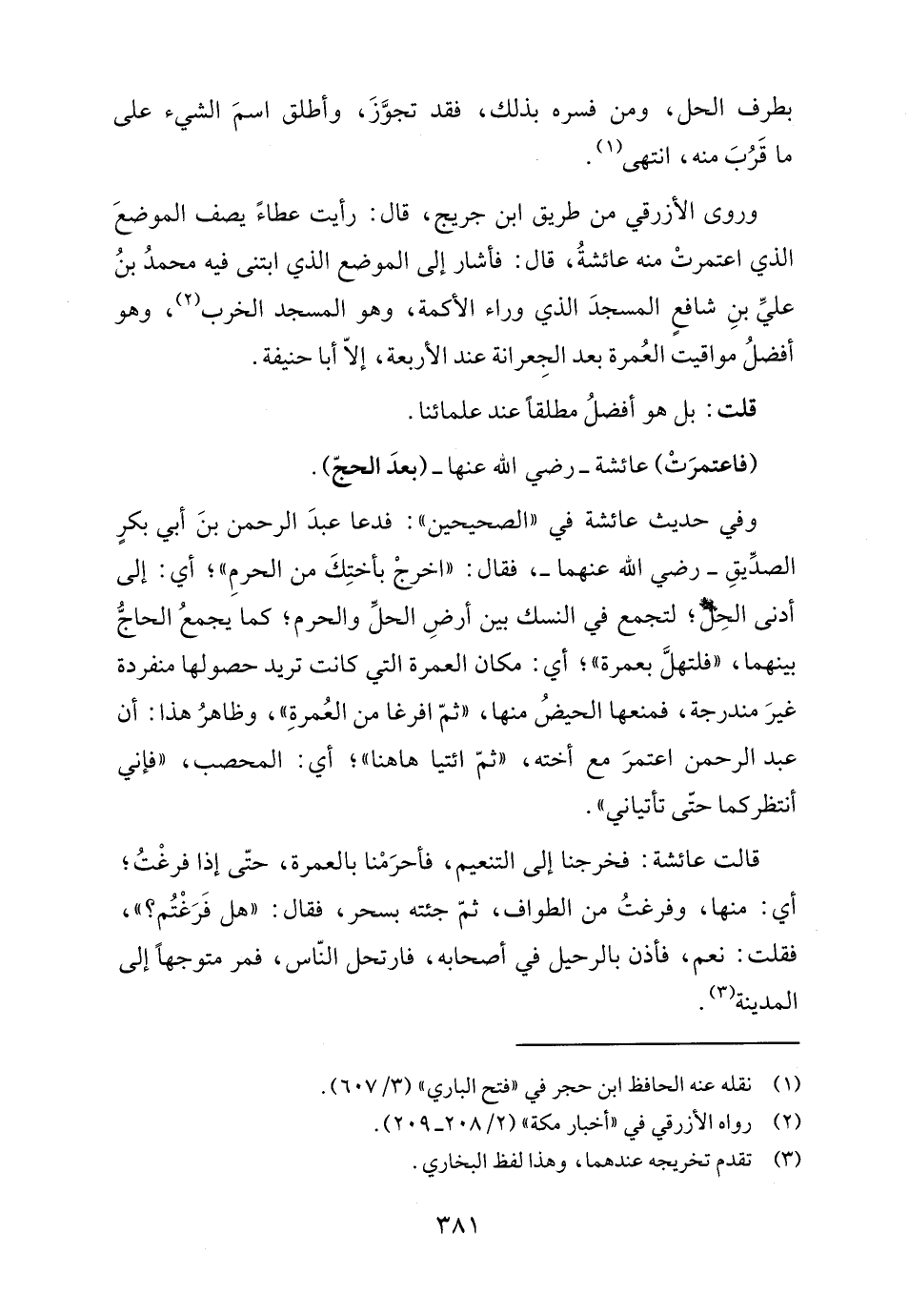 وفي حديث عائشة في "الصحيحين": فدعا عبدَ الرحمن بنَ أبي بكرٍ الصدِّيقِ - رضي الله عنهما -، فقال: "اخرجْ بأختِكَ من الحرمِ"؛ أي: إلى أدنى الحِلِّ؛ لتجمع في النسك بين أرضِ الحلِّ والحرم، كما يجمعُ الحاجُّ بينهما، "فلتهلَّ بعمرة"؛ أي: مكان العمرة التي كانت تريد حصولها منفردة غيرَ مندرجة، فمنعها الحيضُ منها، "ثمّ افرغا من العُمرةِ"، وظاهرُ هذا: أن عبد الرحمن اعتمرَ مع أخته، "ثمّ ائتيا هاهنا"؛ أي: المحصب، "فإني أنتظركما حتّى تأتياني".