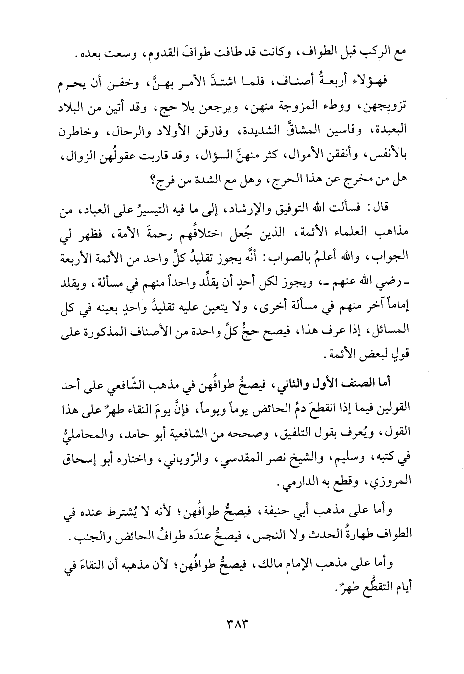 قال: فسألت الله التوفيق والإرشاد، إلى ما فيه التيسيرُ على العباد، من مذاهب العلماء الأئمة، الذين جُعل اختلافُهم رحمةَ الأمة، فظهر لي الجواب، والله أعلمُ بالصواب: أنَّه يجوز تقليدُ كلِّ واحد من الأئمة الأربعة - رضي الله عنهم -، ويجوز لكل أحدٍ أن يقلِّد واحدًا منهم في مسألة، ويقلد إمامًا آخر منهم في مسألة أخرى، ولا يتعين عليه تقليدُ واحدٍ بعينه في كل المسائل، إذا عرف هذا، فيصح حجُّ كلِّ واحدة من الأصناف المذكورة على قولٍ لبعض الأئمة.