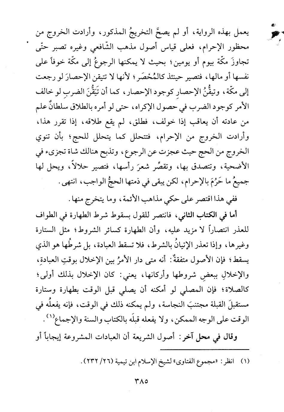 أما في الكتاب الثاني، فانتصر للقول بسقوط شرط الطهارة في الطواف للعذر انتصارًا لا مزيد عليه، وأن الطهارة كسائر الشروط، مثل الستارة وغيرها، وإذا تعذر الإتيانُ بالشرط، فلا تسقط العبادة، بل شرطُها هو الذي يسقط، فإن الأصول متفقةٌ: أنه متى دار الأمرُ بين الإخلال بوقتِ العبادةِ، والإخلالِ ببعضِ شروطها وأركانها، يعني: كان الإخلال بذلك أولى، كالصلاة، فإن المصلي لو أمكنه أن يصلي قبل الوقت بطهارة وستارة مستقبلَ القبلة مجتنبَ النجاسة، ولم يمكنه ذلك في الوقت، فإنه يفعلُه في الوقت على الوجه الممكن، ولا يفعله قبلَه بالكتاب والسنة والإجماع (١).