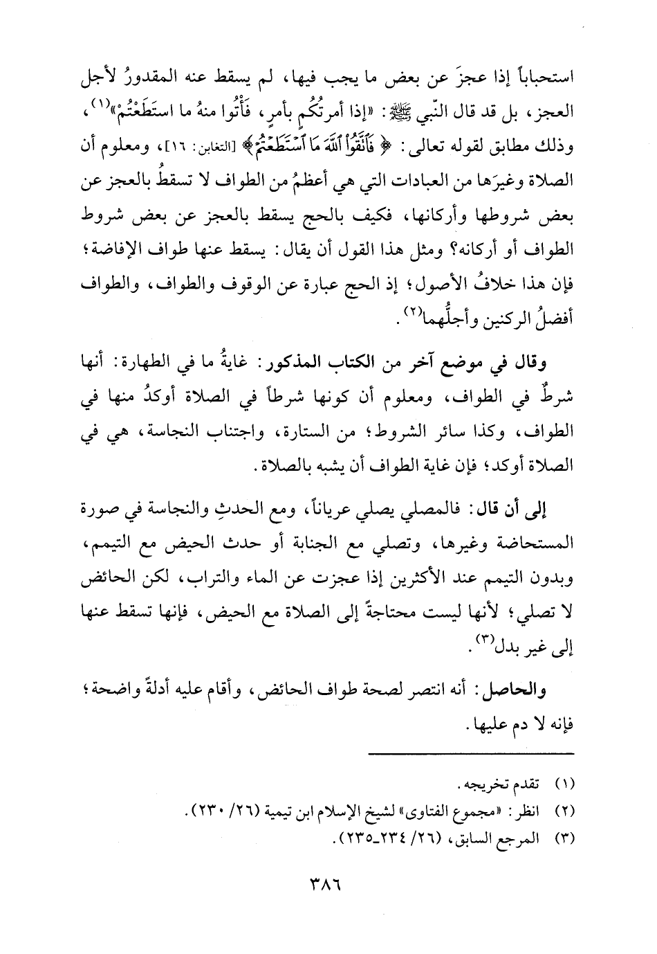 والحاصل: أنه انتصر لصحة طواف الحائض، وأقام عليه أدلةً واضحة، فإنه لا دم عليها.