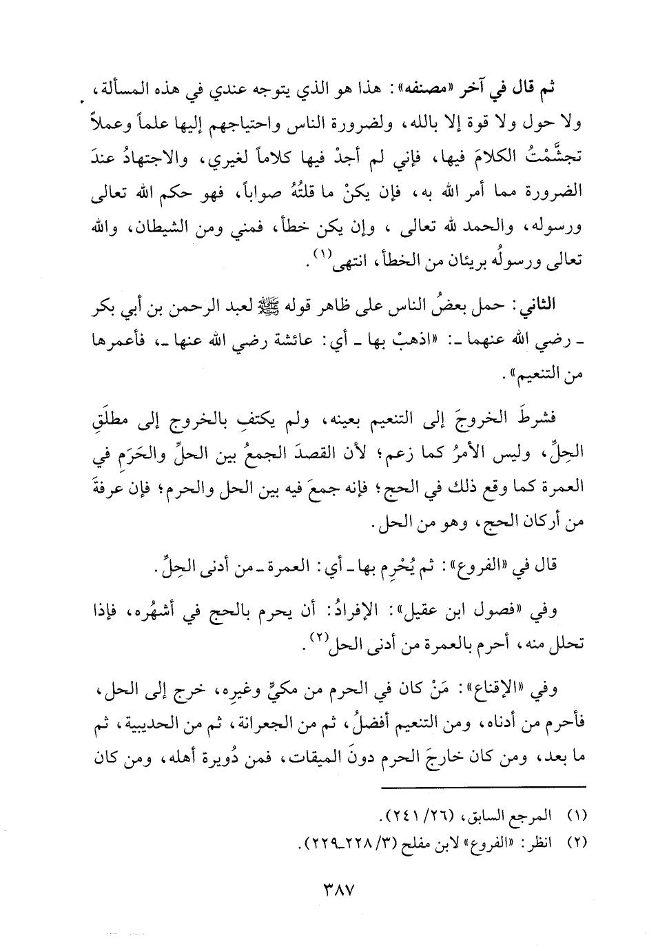 الثاني: حمل بعضُ الناس على ظاهر قوله - صلى الله عليه وسلم - لعبد الرحمن بن أبي بكر - رضي الله عنهما -: "اذهبْ بها -أي: عائشة - رضي الله عنها --، فأعمرها من التنعيم".