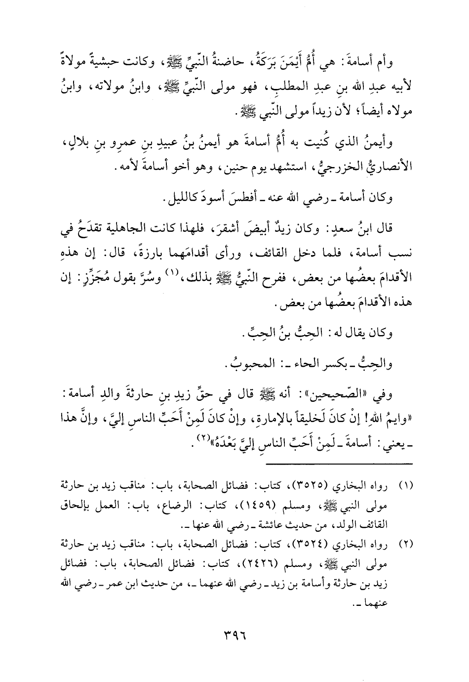 وفي "الصّحيحين": أنه - صلى الله عليه وسلم - قال في حقِّ زيدِ بنِ حارثةَ والدِ أسامة: "وايمُ اللهِ! إنْ كانَ لَخليقًا بالإمارةِ، وإنْ كانَ لَمِنْ أَحَبِّ الناسِ إليَّ، وإنَّ هذا -يعني: أسامةَ- لَمِنْ أَحَبِّ الناسِ إليَّ بَعْدَهُ" (٢).