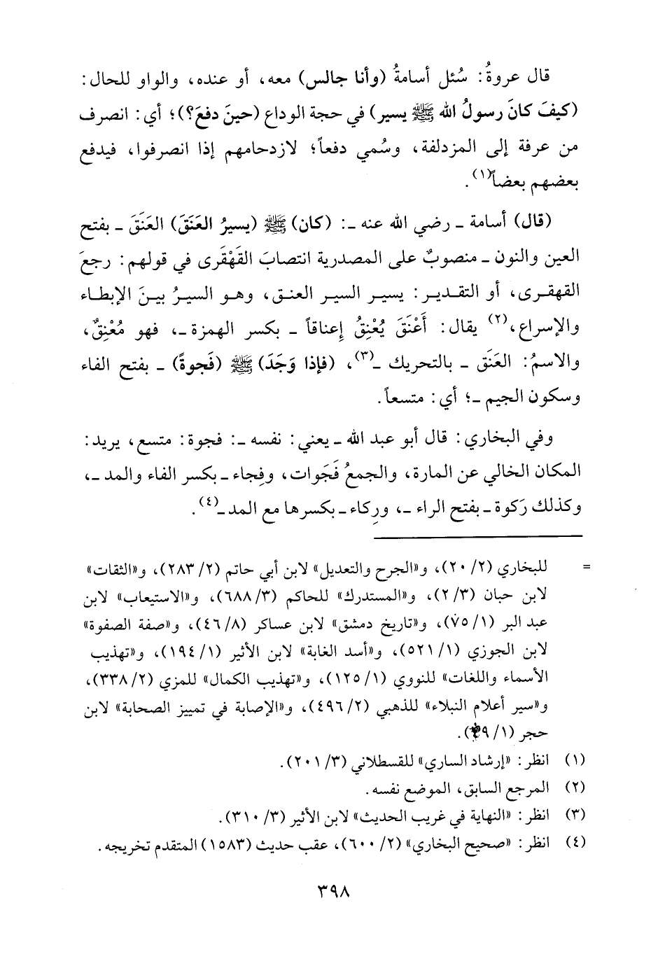 (قال) أسامة - رضي الله عنه -: (كان) - صلى الله عليه وسلم - (يسيرُ العَنَقَ) العَنَقَ -بفتح العين والنون- منصوبٌ على المصدرية انتصابَ القَهْقَرى في قولهم: رجعَ القهقرى، أو التقدير: يسير السير العنق، وهو السيرُ بينَ الإبطاء والإسراع، (٢) يقال: أَعْنَقَ يُعْنِقُ إِعناقًا -بكسر الهمزة-، فهو مُعْنِق، والاسمُ: العَنَق -بالتحريك- (٣)، (فإذا وَجَدَ) - صلى الله عليه وسلم - (فَجوةً) -بفتح الفاء وسكون الجيم-؛ أي: متسعًا.
