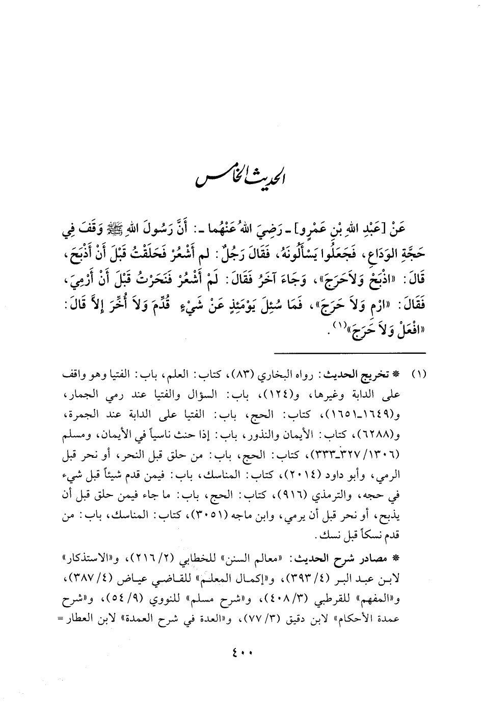 عَنْ [عَبْدِ اللهِ بْنِ عَمْرٍو]- رَضِيَ اللهُ عَنْهُما -: أَنَّ رَسُولَ اللهِ - صلى الله عليه وسلم - وَقَفَ فِي حَجَّةِ الوَدَاعِ، فَجَعَلُوا يَسْأَلُونَهُ، فَقَالَ رَجُلٌ: لم أَشْعُرْ فَحَلَقْتُ قَبْلَ أَنْ أَذْبَحَ، قَالَ: "اذْبَحْ وَلَا حَرَجَ"، وَجَاءَ آخَرُ فَقَالَ: لَمْ أَشْعُرْ فَنَحَرْتُ قَبْلَ أَنْ أَرْمِيَ، فَقَالَ: "ارْمِ وَلَا حَرَجَ"، فَمَا سُئِلَ يَوْمَئِذٍ عَنْ شَيْء قُدِّمَ وَلَا أخِّرَ إلا قَالَ: "افْعَلْ وَلَا حَرَج" (١).