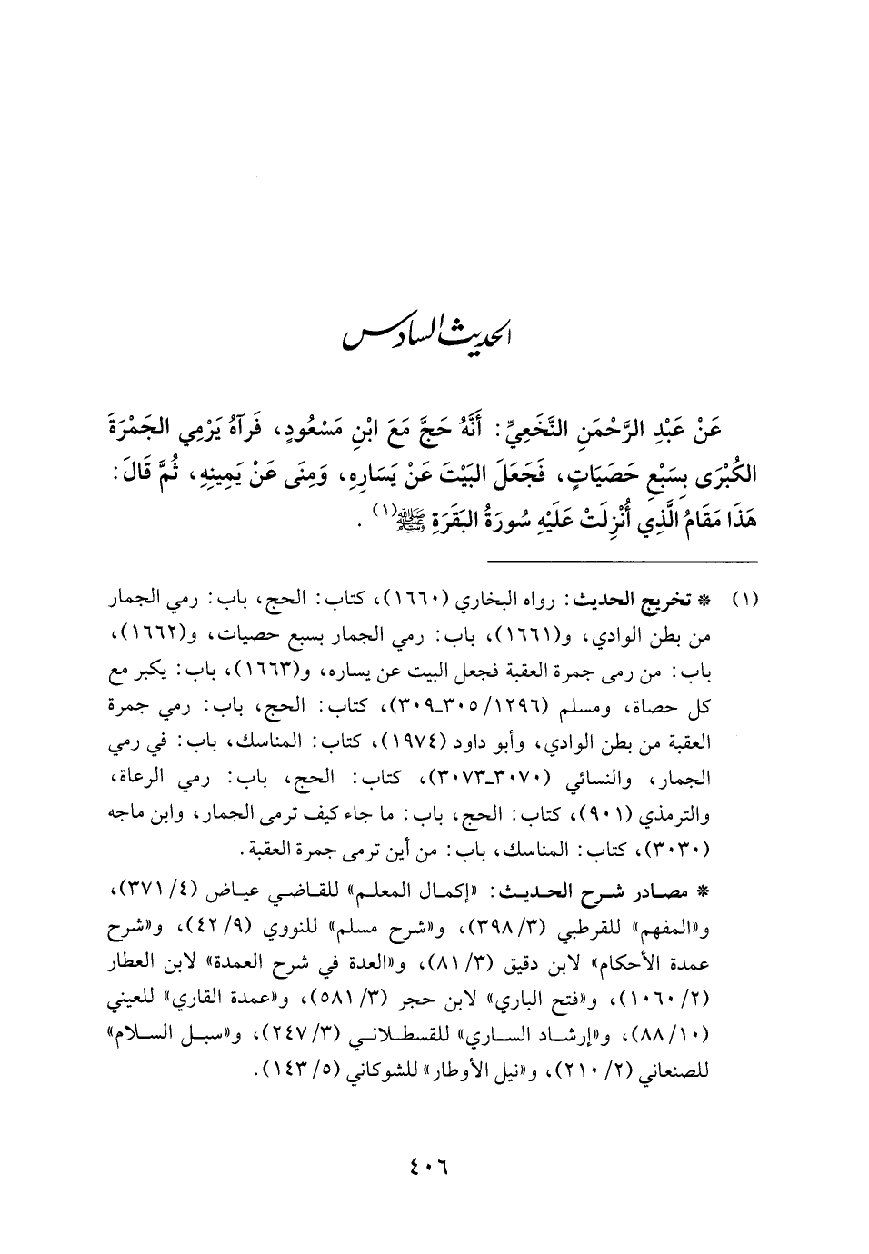 رواه البخاري (١٦٦٠)، كتاب: الحج، باب: رمي الجمار من بطن الوادي، و (١٦٦١)، باب: رمي الجمار بسبع حصيات، و (١٦٦٢)، باب: من رمى جمرة العقبة فجعل البيت عن يساره، و (١٦٦٣)، باب: يكبر مع كل حصاة، ومسلم (١٢٩٦/ ٣٠٥ - ٣٠٩)، كتاب: الحج، باب: رمي جمرة العقبة من بطن الوادي، وأبو داود (١٩٧٤)، كتاب: المناسك، باب: في رمي الجمار، والنسائي (٣٠٧٠ - ٣٠٧٣)، كتاب: الحج، باب: رمي الرعاة، والترمذي (٩٠١)، كتاب: الحج، باب: ما جاء كيف ترمى الجمار، وابن ماجه (٣٠٣٠)، كتاب: المناسك، باب: من أين ترمى جمرة العقبة.
