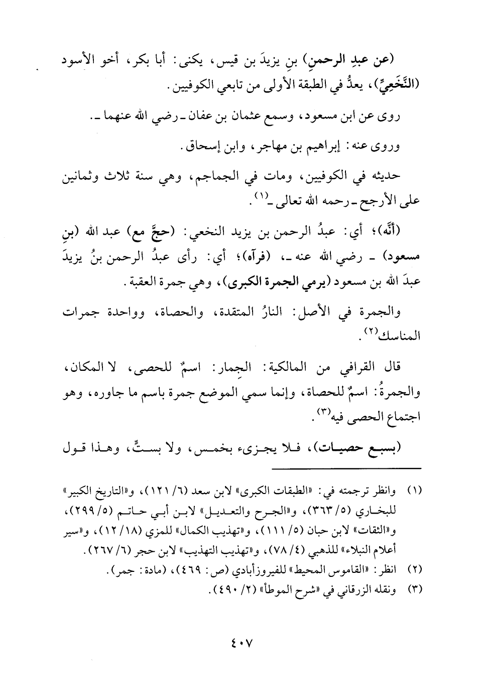 (أنَّه)؛ أي: عبدُ الرحمن بن يزيد النخعي: (حجَّ مع) عبد الله (بنِ مسعود) - رضي الله عنه -، (فرآه)؛ أي: رأى عبدُ الرحمن بنُ يزيدَ عبدَ الله بن مسعود (يرمي الجمرة الكبرى)، وهي جمرة العقبة.