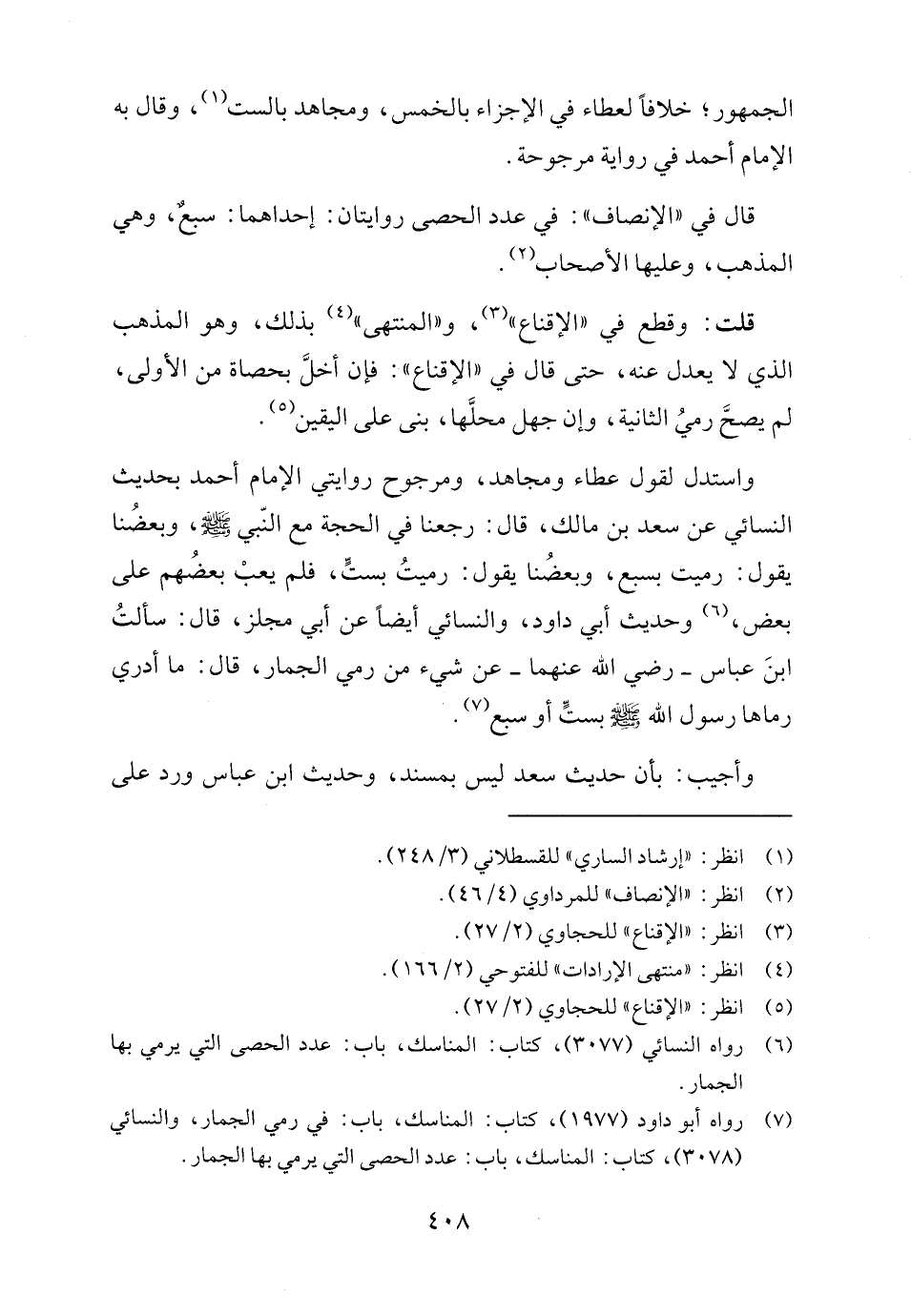 واستدل لقول عطاء ومجاهد، ومرجوح روايتي الإمام أحمد بحديث النسائي عن سعد بن مالك، قال: رجعنا في الحجة مع النّبي - صلى الله عليه وسلم -، وبعضُنا يقول: رميت بسبع، وبعضُنا يقول: رميتُ بستٍّ، فلم يعبْ بعضهم على بعض، (٦) وحديث أبي داود، والنسائي أيضًا عن أبي مجلز، قال: سألتُ ابنَ عباس - رضي الله عنهما - عن شيء من رمي الجمار، قال: ما أدري رماها رسول الله - صلى الله عليه وسلم - بستٍّ أو سبع (٧).