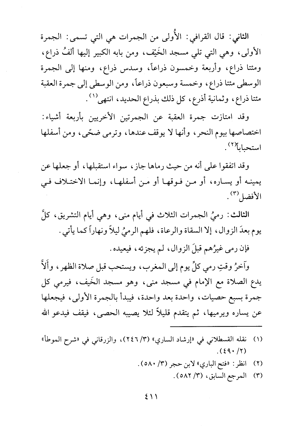 الثاني: قال القرافي: الأُولى من الجمرات هي التي تسمى: الجمرة الأولى، وهي التي تلي مسجد الخَيْف، ومن بابه الكبير إليها ألفُ ذراع، ومئتا ذراع، وأربعة وخمسون ذراعًا، وسدس ذراع، ومنها إلى الجمرة الوسطى مئتا ذراع، وخمسة وسبعون ذراعًا، ومن الوسطى إلى جمرة العقبة مئتا ذراع، وثمانية أذرع، كل ذلك بذراع الحديد، انتهى (١).
