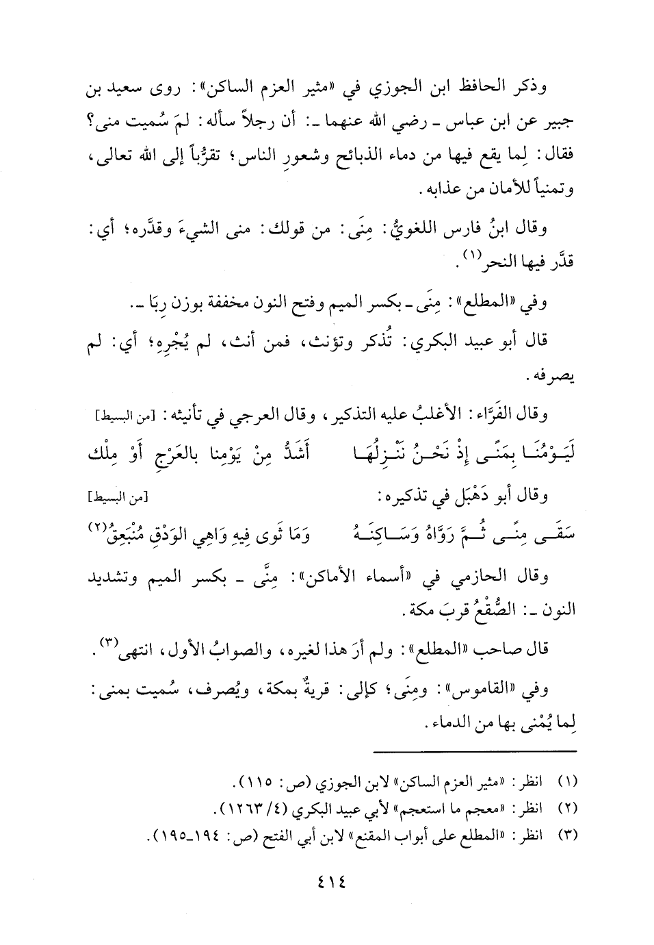 وذكر الحافظ ابن الجوزي في "مثير العزم الساكن": روى سعيد بن جبير عن ابن عباس - رضي الله عنهما -: أن رجلًا سأله: لمَ سُميت منى؟ فقال: لِما يقع فيها من دماء الذبائح وشعورِ الناس، تقرُّبًا إلى الله تعالى، وتمنيًا للأمان من عذابه.