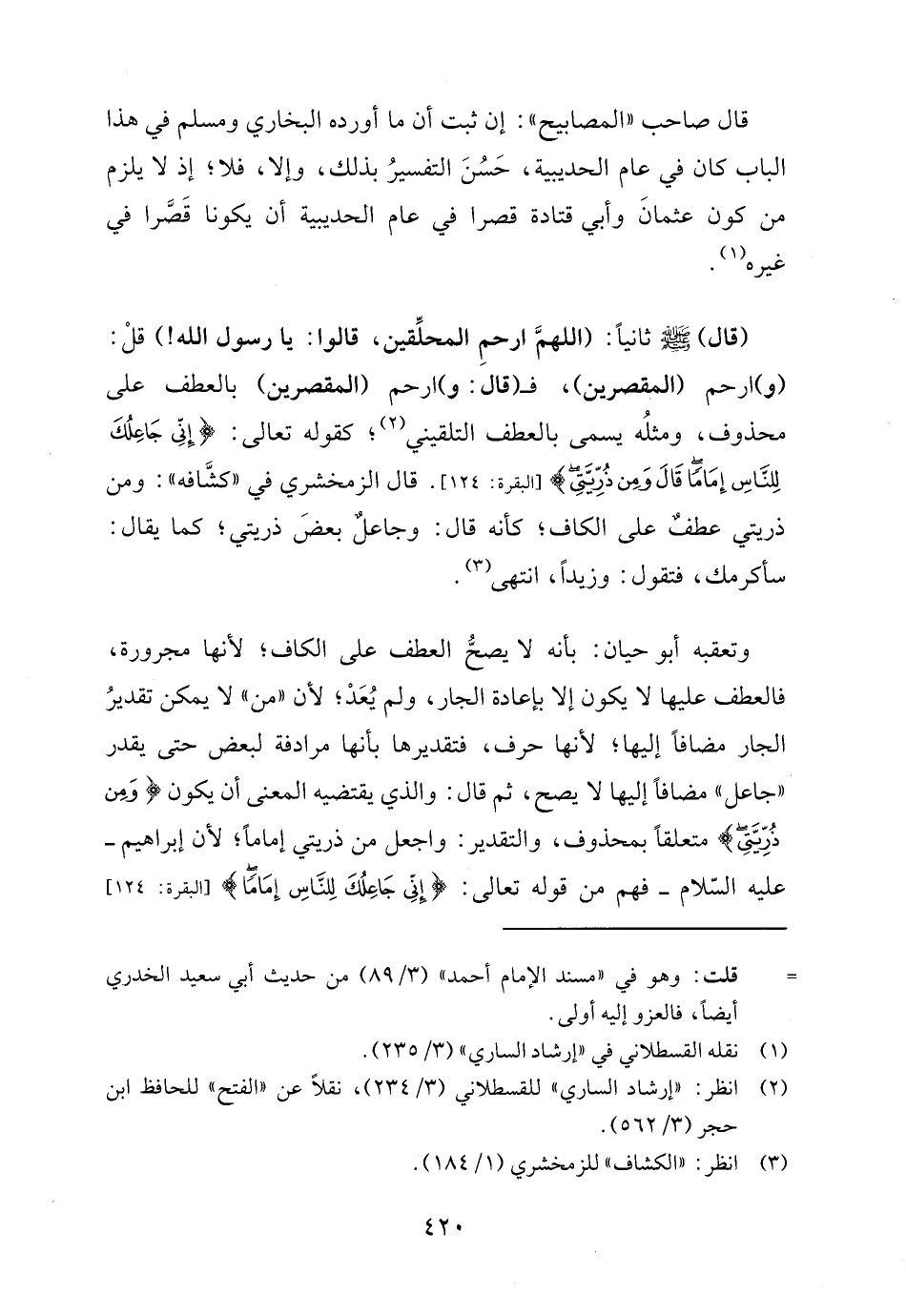 وتعقبه أبو حيان: بأنه لا يصحُّ العطف على الكاف؛ لأنها مجرورة، فالعطف عليها لا يكون إلا بإعادة الجار، ولم يُعَدْ؛ لأن "من" لا يمكن تقديرُ الجار مضافًا إليها؛ لأنها حرف، فتقديرها بأنها مرادفة لبعض حتى يقدر "جاعل" مضافًا إليها لا يصح، ثم قال: والذي يقتضيه المعنى أن يكون {وَمِنْ ذُرِّيَّتِي} متعلقًا بمحذوف، والتقدير: واجعل من ذريتي إمامًا؛ لأن إبراهيم -عليه السّلام- فهم من قوله تعالى: {إِنِّي جَاعِلُكَ لِلنَّاسِ إِمَامًا} [البقرة: ١٢٤]