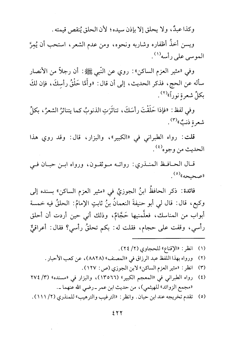 وفي "مثير العزم الساكن": روي عن النّبي - صلى الله عليه وسلم -: أن رجلًا من الأنصار سأله عن الحج، فذكر الحديث، إلى أن قال: "وأَمَّا حَلْقُ رأسِكَ، فإن لكَ بكلِّ شعرةٍ نورًا" (٢).