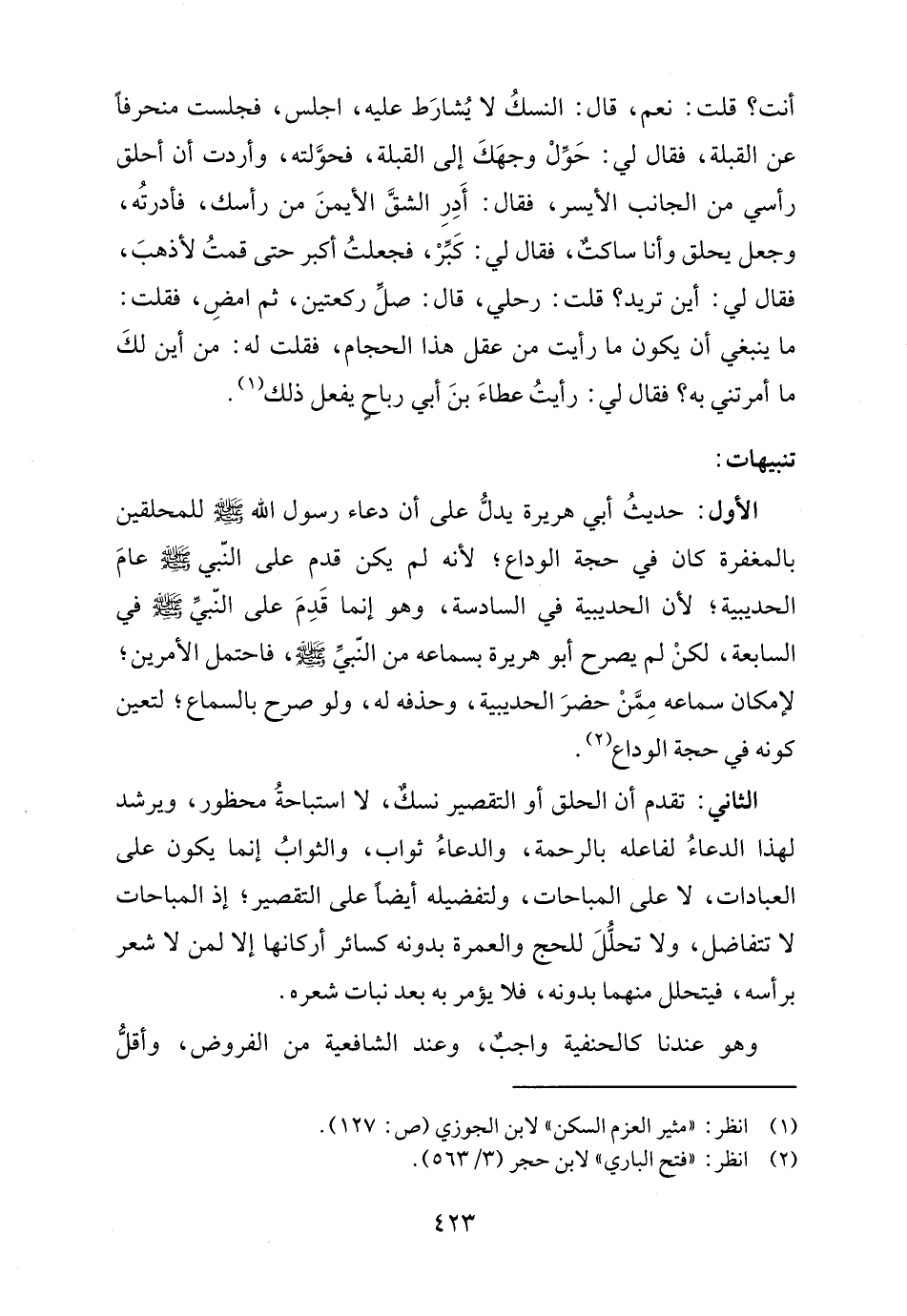 أنت؟ قلت: نعم، قال: النسكُ لا يُشارَط عليه، اجلس، فجلست منحرفًا عن القبلة، فقال لي: حَوِّلْ وجهَكَ إلى القبلة، فحوَّلته، وأردت أن أحلق رأسي من الجانب الأيسر، فقال: أَدِرِ الشقَّ الأيمنَ من رأسك، فأدرتُه، وجعل يحلق وأنا ساكتٌ، فقال لي: كَبِّرْ، فجعلتُ أكبر حتى قمتُ لأذهبَ، فقال لي: أين تريد؟ قلت: رحلي، قال: صلِّ ركعتين، ثم امضِ، فقلت: ما ينبغي أن يكون ما رأيت من عقل هذا الحجام، فقلت له: من أين لكَ ما أمرتني به؟ فقال لي: رأيتُ عطاءَ بنَ أبي رباحٍ يفعل ذلك (١).