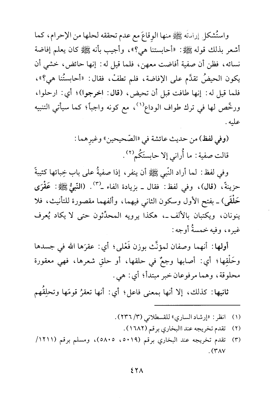 وفي لفظ: لما أراد النّبي - صلى الله عليه وسلم - أن ينفر، إذا صفيةُ على باب خِبائها كئيبةً حزينةً، (قال)، وفي لفظ: فقال -بزيادة الفاء- (٣). (النّبيُّ - صلى الله عليه وسلم -: عَقْرَى حَلْقَى) -بفتح الأول وسكون الثاني فيهما، وألفهما مقصورة للتأنيث، فلا ينونان، ويكتبان بالألف-، هكذا يرويه المحدِّثون حتى لا يكاد يُعرف غيره، وفيه خمسةُ أوجه: