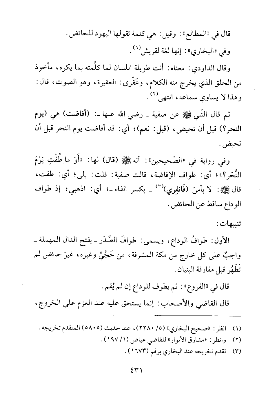وفي رواية في "الصّحيحين": أنه - صلى الله عليه وسلم - (قال) لها: "أَوَ ما طُفْتِ يَوْمَ النَّحْر؟ "؛ أي: طواف الإفاضة، قالت صفية: قلت: بلى؛ أي: طفت، قال - صلى الله عليه وسلم -: لا بأسَ (فَانفِري) (٣) -بكسر الفاء-؛ أي: اذهبي؛ إذ طواف الوداع ساقط عن الحائض.