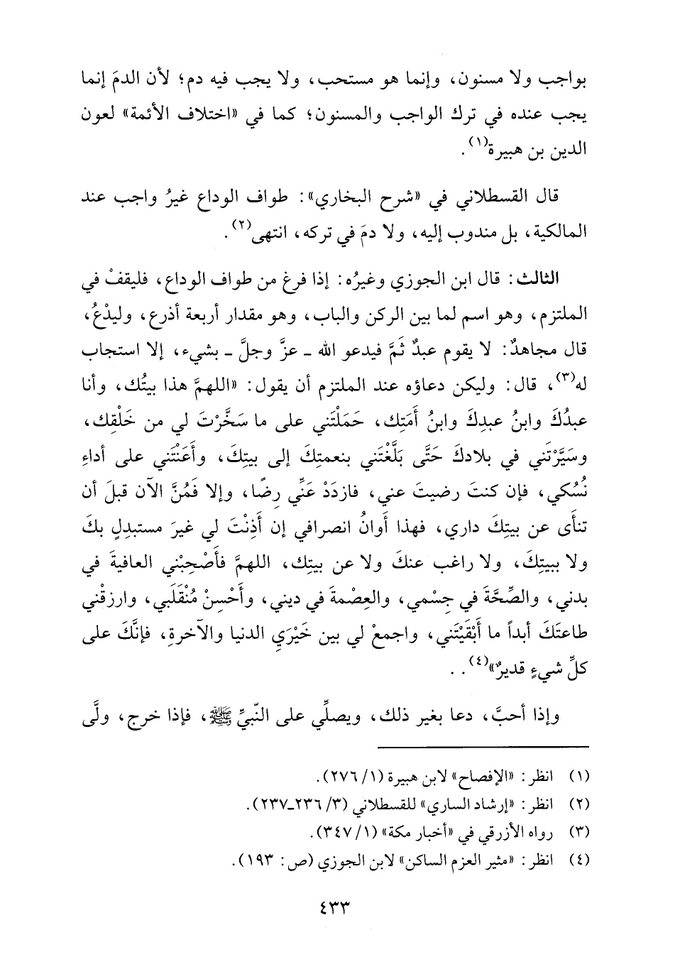 الثالث: قال ابن الجوزي وغيرُه: إذا فرغ من طواف الوداع، فليقفْ في الملتزم، وهو اسم لما بين الركن والباب، وهو مقدار أربعة أذرع، وليدْعُ، قال مجاهدٌ: لا يقوم عبدٌ ثَمَّ فيدعو الله -عزَّ وجلَّ- بشيء، إلا استجاب له (٣)، قال: وليكن دعاؤه عند الملتزم أن يقول: "اللهمَّ هذا بيتُك، وأنا عبدُكَ وابنُ عبدِكَ وابنُ أَمَتِك، حَمَلْتَني على ما سَخَّرْتَ لي من خَلْقِك، وسَيَّرْتَني في بلادكَ حَتَّى بَلَّغْتَني بنعمتِكَ إلى بيتِكَ، وأَعَنْتَني على أداءِ نُسُكي، فإن كنتَ رضيتَ عني، فازدَدْ عَنِّي رِضًا، وإلا فَمُنَّ الآن قبلَ أن تنأَى عن بيتِكَ داري، فهذا أَوانُ انصرافي إن أَذِنْتَ لي غيرَ مستبدِلٍ بكَ ولا ببيتِكَ، ولا راغب عنكَ ولا عن بيتِك، اللهمَّ فأَصحِبْني العافيةَ في بدني، والصِّحَّةَ في جِسْمي، والعِصمةَ في ديني، وأَحْسِنْ مُنْقَلَبي، وارزقْني طاعتَكَ أبدًا ما أَبْقَيْتَني، واجمعْ لي بين خَيْرَيِ الدنيا والآخرةِ، فإنَّكَ على كلِّ شيءٍ قديرٌ" (٤).