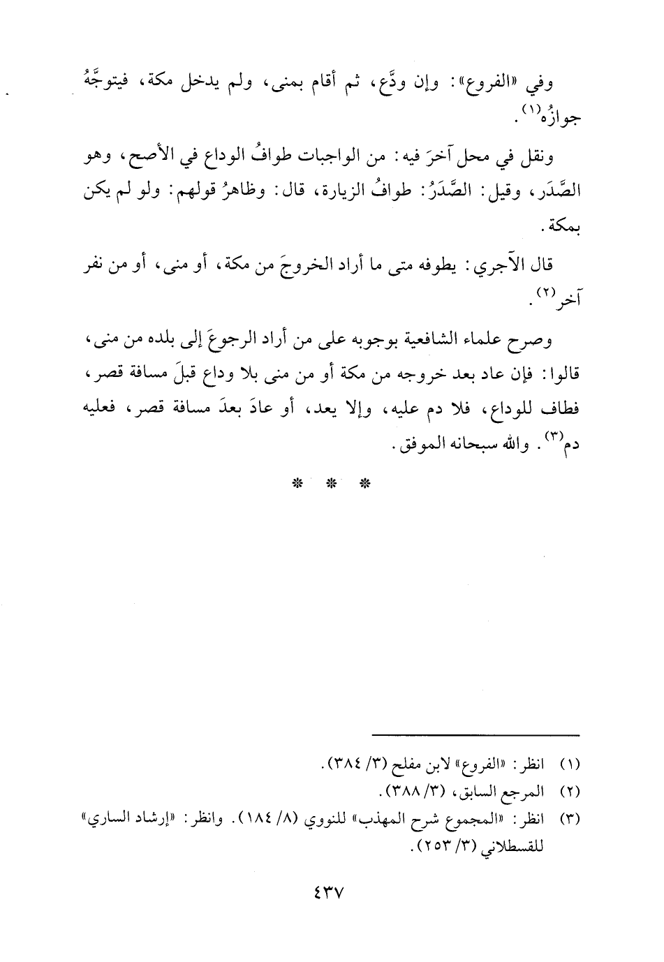 وصرح علماء الشافعية بوجوبه على من أراد الرجوعَ إلى بلده من منى، قالوا: فإن عاد بعد خروجه من مكة أو من منى بلا وداع قبلَ مسافة قصر، فطاف للوداع، فلا دم عليه، وإلا يعد، أو عادَ بعدَ مسافة قصر، فعليه دم (٣). والله سبحانه الموفق.