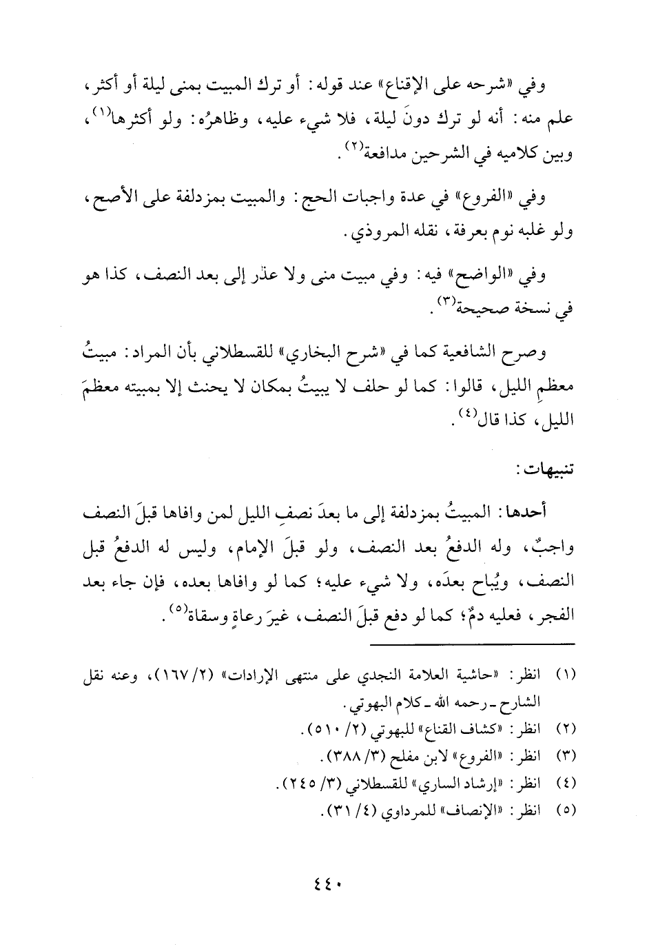 أحدها: المبيتُ بمزدلفة إلى ما بعدَ نصفِ الليل لمن وافاها قبلَ النصف واجبٌ، وله الدفعُ بعد النصف، ولو قبلَ الإمام، وليس له الدفعُ قبل النصف، ويُباح بعدَه، ولا شيء عليه، كما لو وافاها بعده، فإن جاء بعد الفجر، فعليه دم؛ كما لو دفع قبلَ النصف، غيرَ رعاةٍ وسقاة (٥).