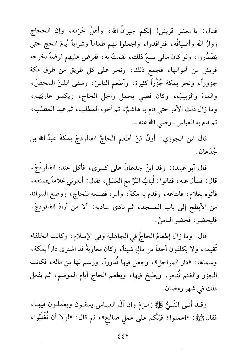 قال ابن الجوزي: أولُ مَنْ أطعم الحاجَّ الفالوذجَ بمكةَ عبدُ الله بن جُدْعان.