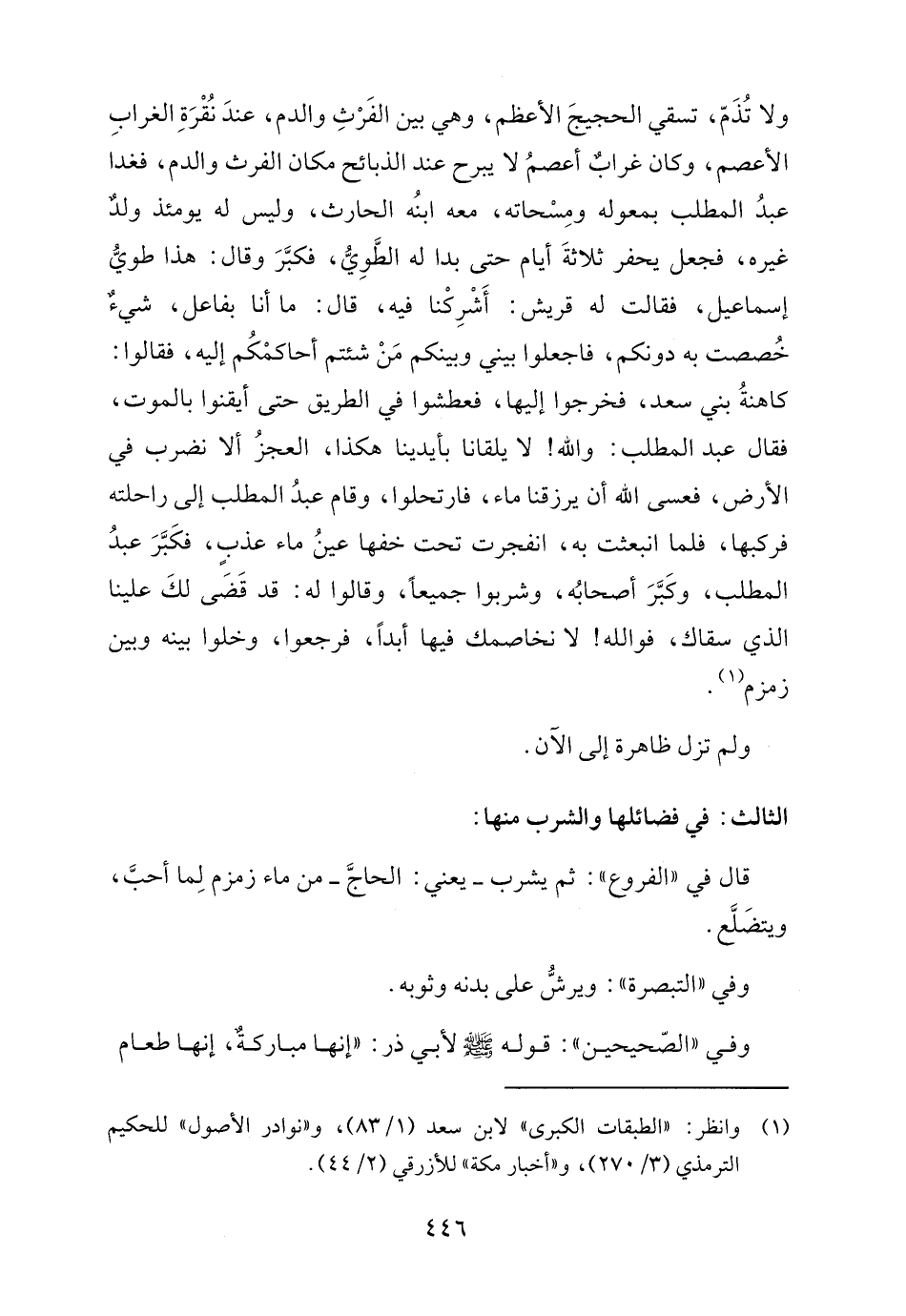 ولا تُذَمّ، تسقي الحجيجَ الأعظم، وهي بين الفَرْثِ والدم، عندَ نُقْرَةِ الغرابِ الأعصم، وكان غرابٌ أعصمُ لا يبرح عند الذبائح مكان الفرث والدم، فغدا عبدُ المطلب بمعوله ومِسْحاته، معه ابنُه الحارث، وليس له يومئذ ولدٌ غيره، فجعل يحفر ثلاثةَ أيام حتى بدا له الطَّوِيُّ، فكبَّرَ وقال: هذا طويُّ إسماعيل، فقالت له قريش: أَشْرِكْنا فيه، قال: ما أنا بفاعل، شيءٌ خُصصت به دونكم، فاجعلوا بيني وبينكم مَنْ شئتم أحاكمْكُم إليه، فقالوا: كاهنةُ بني سعد، فخرجوا إليها، فعطشوا في الطريق حتى أيقنوا بالموت، فقال عبد المطلب: والله! لا يلقانا بأيدينا هكذا، العجزُ ألا نضرب في الأرض، فعسى الله أن يرزقنا ماء، فارتحلوا، وقام عبدُ المطلب إلى راحلته فركبها، فلما انبعثت به، انفجرت تحت خفها عينُ ماء عذبٍ، فكَبَّرَ عبدُ المطلب، وكَبَّرَ أصحابُه، وشربوا جميعًا، وقالوا له: قد قَضَى لكَ علينا الذي سقاك، فوالله! لا نخاصمك فيها أبدًا، فرجعوا، وخلوا بينه وبين زمزم (١).