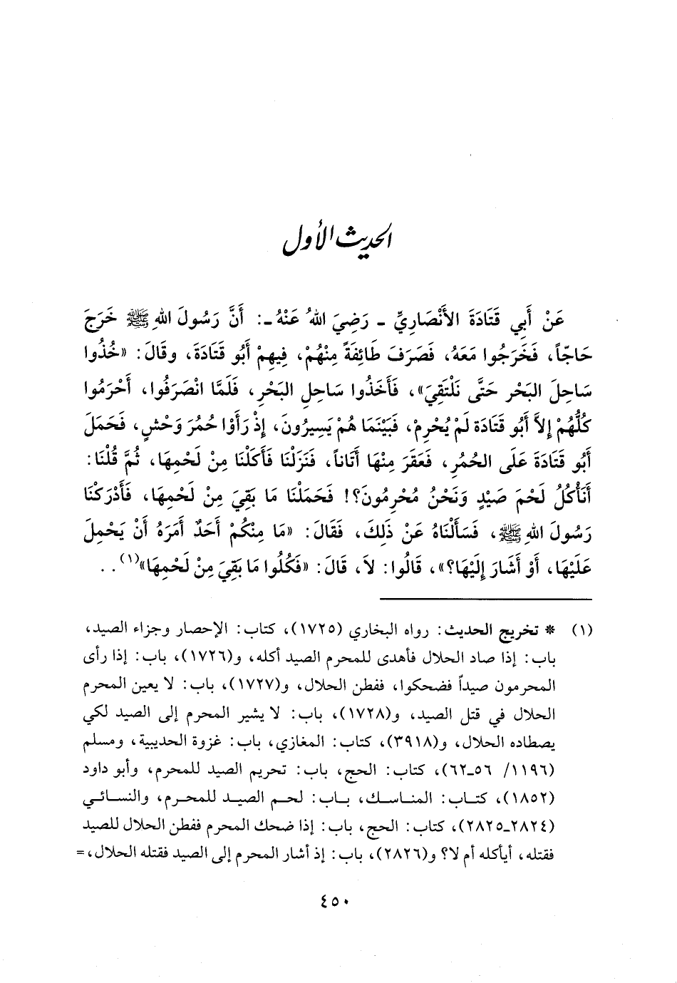 عَنْ أَبي قَتَادَةَ الأَنْصَارِيِّ - رَضِيَ اللهُ عَنْهُ -: أَنَّ رَسُولَ اللهِ - صلى الله عليه وسلم - خَرَجَ حَاجًّا، فَخَرَجُوا مَعَهُ، فَصَرَفَ طَائِفَةً مِنْهُمْ، فِيهِمْ أَبُو قَتَادَةَ، وقَالَ: "خُذُوا سَاحِلَ البَحْر حَتَّى نَلْتَقِيَ"، فَأَخَذُوا سَاحِلِ البَحْرِ، فَلَمَّا انْصَرَفُوا، أَحْرَمُوا كلُّهُمْ إِلَّا أَبُو قَتَادَة لَمْ يُحْرِمْ، فَبَيْنَمَا هُمْ يَسِيرُونَ، إِذْ رَأَوْا حُمُرَ وَحْشٍ، فَحَمَلَ أَبُو قَتَادَةَ عَلَى الحُمُرِ، فَعَقَرَ مِنْهَا أتانًا، فَنَزَلْنَا فَأكلْنَا مِنْ لَحْمِهَا، ثُمَّ قُلْنَا: أَنَأْكُلُ لَحْمَ صَيْدٍ وَنَحْنُ مُحْرِمُونَ؟! فَحَمَلْنَا مَا بقِيَ مِنْ لَحْمِهَا، فَأَدْرَكْنَا رَسُولَ اللهِ - صلى الله عليه وسلم -، فَسَأَلْنَاهُ عَنْ ذَلِكَ، فَقَالَ: "مَا مِنْكُمْ أَحَدٌ أَمَرَهُ أَنْ يَحْمِلَ عَلَيْهَا، أَوْ أَشَارَ إِلَيْهَا؟ "، قَالُوا: لَا، قَالَ: "فَكُلُوا مَا بقِيَ مِنْ لَحْمِهَا" (١). .