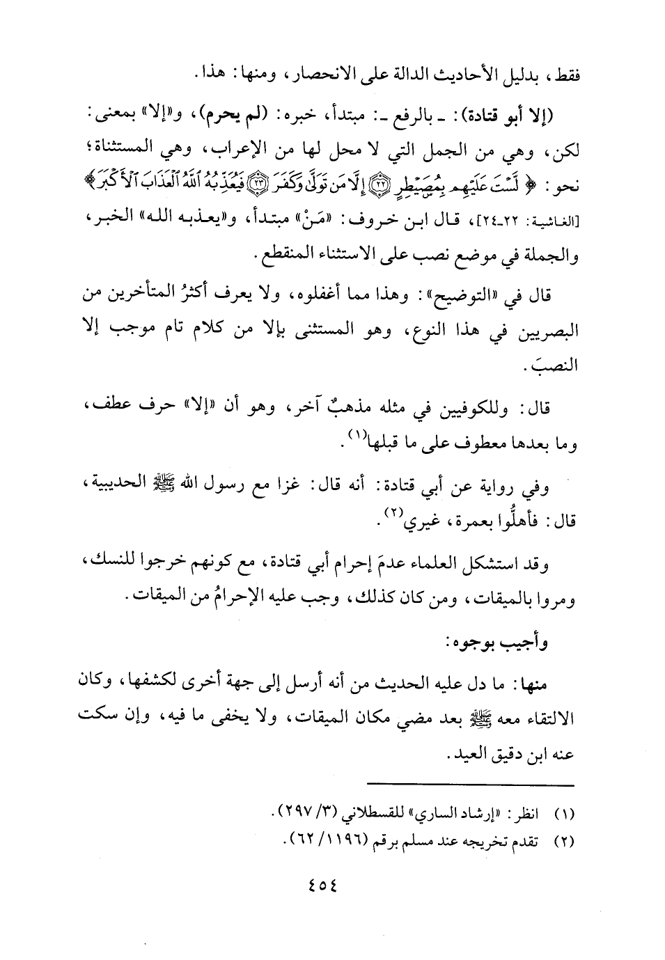(إلا أبو قتادة): -بالرفع-: مبتدأ، خبره: (لم يحرم)، و"إلا" بمعنى: لكن، وهي من الجمل التي لا محل لها من الإعراب، وهي المستثناة، نحو: {لَسْتَ عَلَيْهِمْ بِمُصَيْطِرٍ (٢٢) إِلَّا مَنْ تَوَلَّى وَكَفَرَ (٢٣) فَيُعَذِّبُهُ اللَّهُ الْعَذَابَ الْأَكْبَرَ} [الغاشية: ٢٢ - ٢٤]، قال ابن خروف: "مَنْ" مبتدأ، و"يعذبه الله" الخبر، والجملة في موضع نصب على الاستثناء المنقطع.