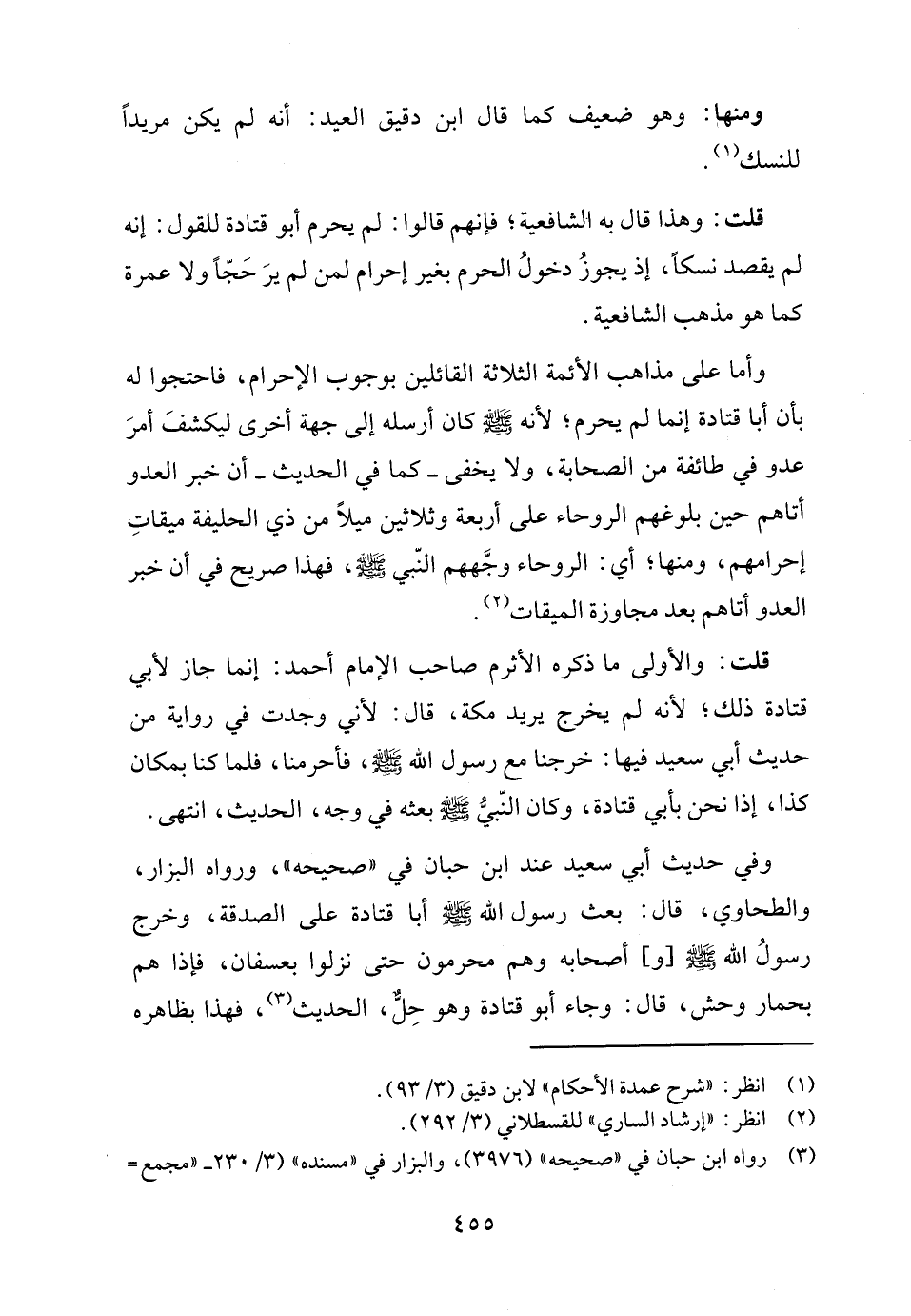 قلت: وهذا قال به الشافعية، فإنهم قالوا: لم يحرم أبو قتادة للقول: إنه لم يقصد نسكًا، إذ يجوزُ دخولُ الحرم بغير إحرام لمن لم يرَ حَجًّا ولا عمرة كما هو مذهب الشافعية.
