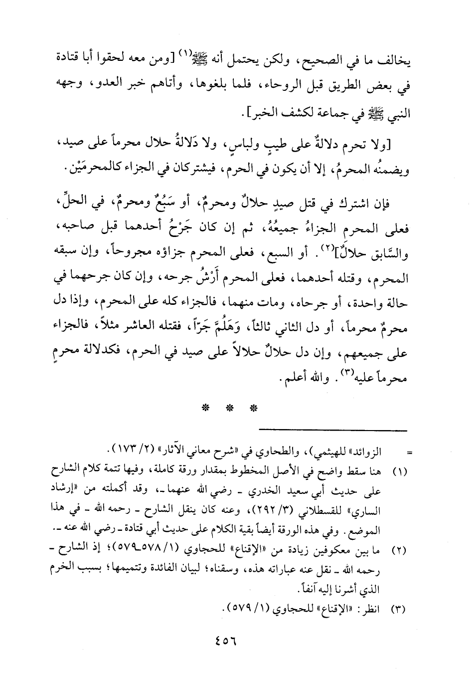 فإن اشترك في قتل صيدٍ حلالٌ ومحرمٌ، أو سَبُعٌ ومحرمٌ، في الحلِّ، فعلى المحرم الجزاءُ جميعُهُ، ثم إن كان جَرْحُ أحدهما قبل صاحبه، والسَّابق حلالٌ] (٢). أو السبع، فعلى المحرم جزاؤه مجروحًا، وإن سبقه المحرم، وقتله أحدهما، فعلى المحرم أَرْشُ جرحه، وإن كان جرحهما في حالة واحدة، أو جرحاه، ومات منهما، فالجزاء كله على المحرم، وإذا دل محرم محرمًا، أو دل الثاني ثالثًا، وَهَلُمَّ جَرًّا، فقتله العاشر مثلًا، فالجزاء على جميعهم، وإن دل حلالٌ حلالًا على صيد في الحرم، فكدلالة محرمٍ محرمًا عليه (٣). والله أعلم.