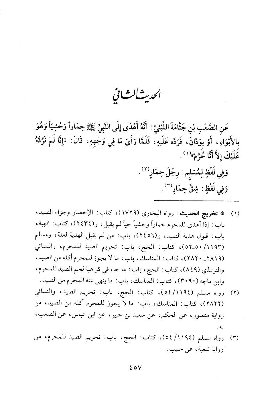 عَنِ الصَّعْبِ بْنِ جَثَّامَةَ اللَّيْثيِّ: أَنَّهُ أَهْدَى إِلَى النَّبِيِّ - صلى الله عليه وسلم - حِمَارًا وَحْشِيًّا وَهُوَ بالأَبْوَاءِ، أَوْ بِوَدَّانَ، فَرَدَّه عَلَيْهِ، فَلَمَّا رَأَىَ مَا فِي وَجْهِهِ، قَالَ: "إِنَّا لَمْ نَرُدَّهُ علَيكَ إِلَّا أنَّا حُرُم" (١).