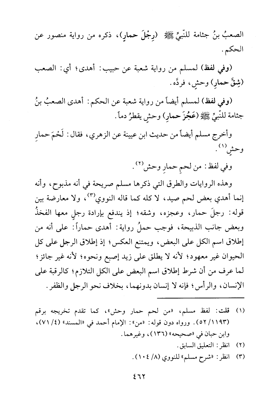 وهذه الروايات والطرق التي ذكرها مسلم صريحة في أنه مذبوح، وأنه إنما أهدي بعض لحم صيد، لا كله كما قاله النووي (٣)، ولا معارضة بين قوله: رجلَ حمار، وعجزه، وشقه، إذ يندفع بإرادة رجلٍ معها الفخذُ وبعض جانب الذبيحة، فوجب حملُ رواية: أهدى حمارا: على أنه من إطلاق اسم الكل على البعض، ويمتنع العكس، إذ إطلاق الرجل على كل الحيوان غير معهود؛ لأنه لا يطلق على زيد إصبع ونحوه؛ لأنه غير جائز، لما عرف من أن شرط إطلاق اسم البعض على الكل التلازم، كالرقبة على الإنسان، والرأس، فإنه لا إنسان بدونهما، بخلاف نحو الرجل والظفر.