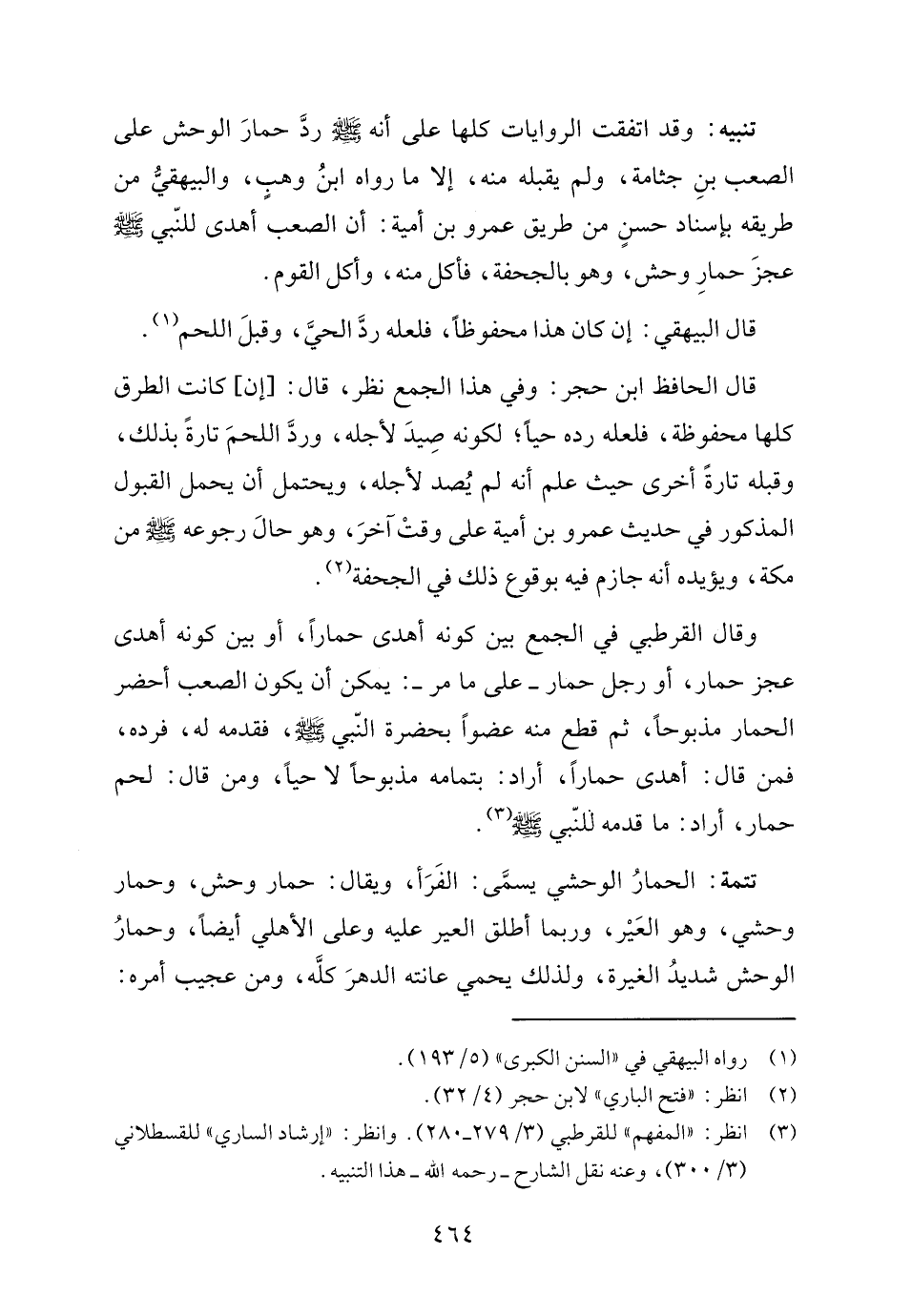 تنبيه: وقد اتفقت الروايات كلها على أنه - صلى الله عليه وسلم - ردَّ حمارَ الوحش على الصعب بنِ جثامة، ولم يقبله منه، إلا ما رواه ابنُ وهبٍ، والبيهقيُّ من طريقه بإسناد حسنٍ من طريق عمرو بن أمية: أن الصعب أهدى للنّبي - صلى الله عليه وسلم -
