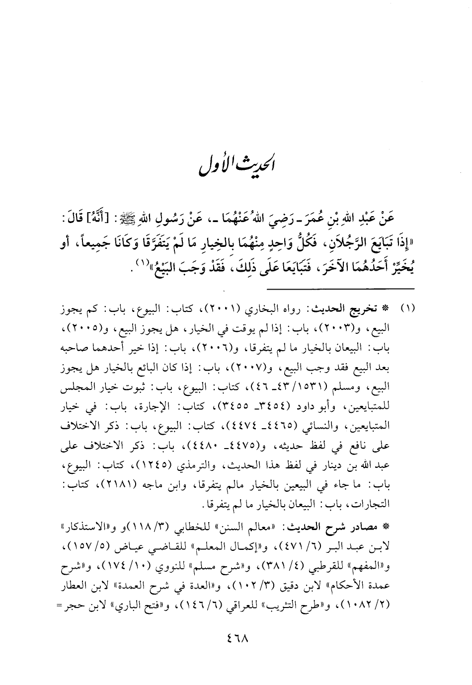 عَنْ عَبْدِ اللهِ بْنِ عُمَرَ - رَضِيَ اللهُ عَنْهُمَا -، عَنْ رَسُولِ اللهِ - صلى الله عليه وسلم -: [أَنَّهُ] قَالَ: "إِذَا تَبَايَعَ الرَّجُلَانِ، فَكُلُّ وَاحِدٍ مِنْهُمَا بالخِيارِ مَا لَمْ يَتَفَرَّقَا وَكانَا جَمِيعًا، أو يُخَيِّرْ أَحَدُهُمَا الآخَرَ، فَتَبَايَعَا عَلَى ذَلِكَ، فَقَدْ وَجَبَ البَيعُ" (١).