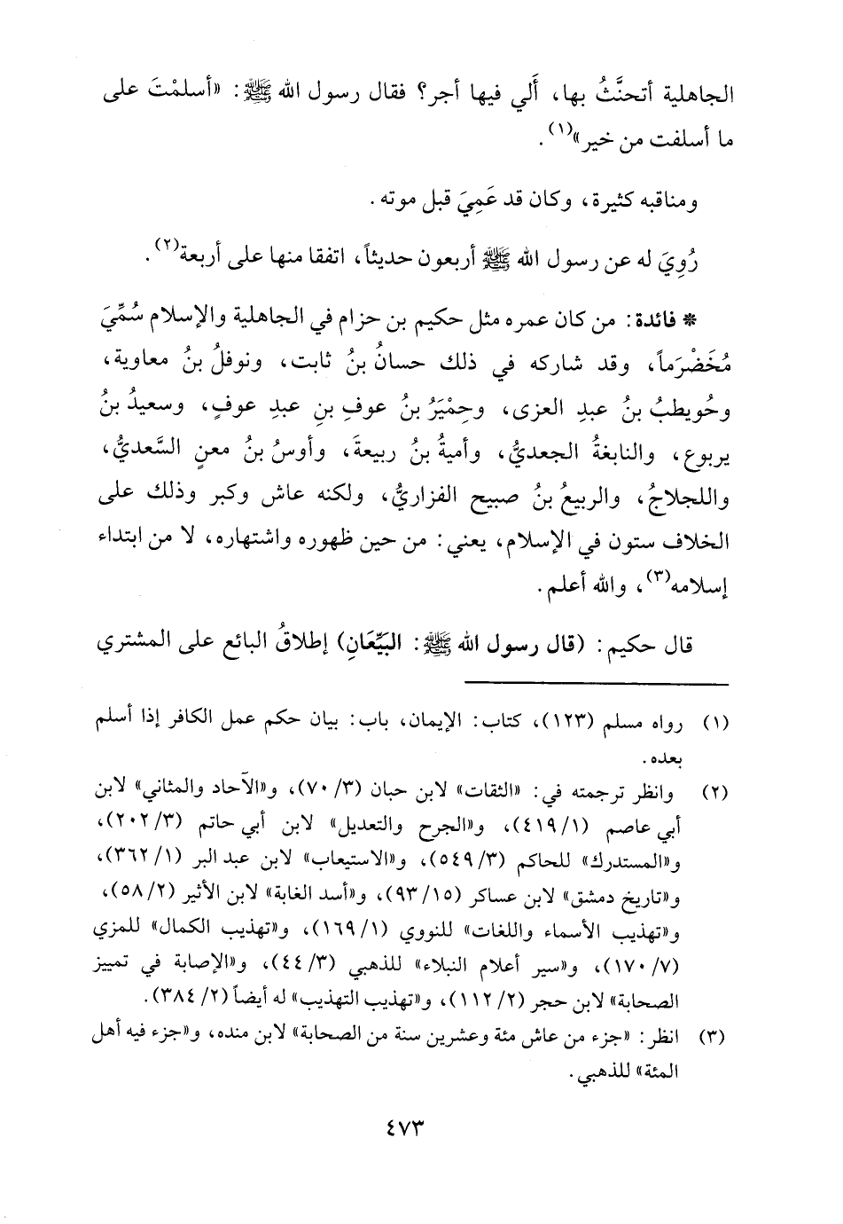 * فائدة: من كان عمره مثل حكيم بن حزام في الجاهلية والإسلام سُمِّيَ مُخَضْرَمًا، وقد شاركه في ذلك حسانُ بنُ ثابت، ونوفلُ بنُ معاوية، وحُويطبُ بنُ عبدِ العزى، وحِمْيَرُ بنُ عوفِ بنِ عبدِ عوفٍ، وسعيدُ بنُ يربوع، والنابغةُ الجعديُّ، وأميةُ بنُ ربيعةَ، وأوسُ بنُ معنٍ السَّعديُّ، واللجلاجُ، والربيعُ بنُ صبيح الفزاريُّ، ولكنه عاش وكبر وذلك على الخلاف ستون في الإسلام، يعني: من حين ظهوره واشتهاره، لا من ابتداء إسلامه (٣)، والله أعلم.
