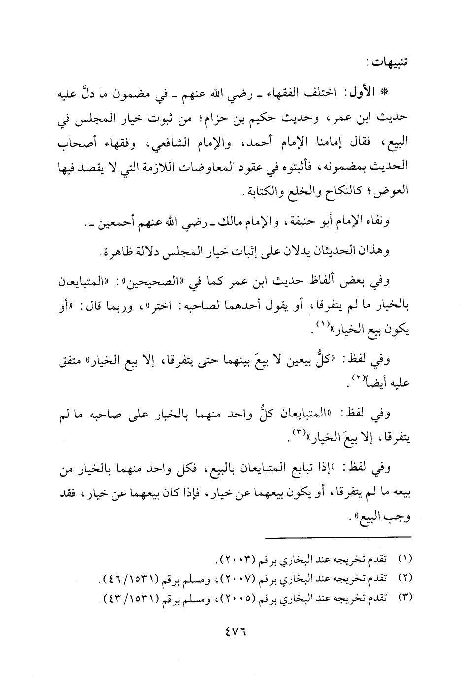 * الأول: اختلف الفقهاء - رضي الله عنهم - في مضمون ما دلَّ عليه حديث ابن عمر، وحديث حكيم بن حزام، من ثبوت خيار المجلس في البيع، فقال إمامنا الإمام أحمد، والإمام الشافعي، وفقهاء أصحاب الحديث بمضمونه، فأثبتوه في عقود المعاوضات اللازمة التي لا يقصد فيها العوض، كالنكاح والخلع والكتابة.