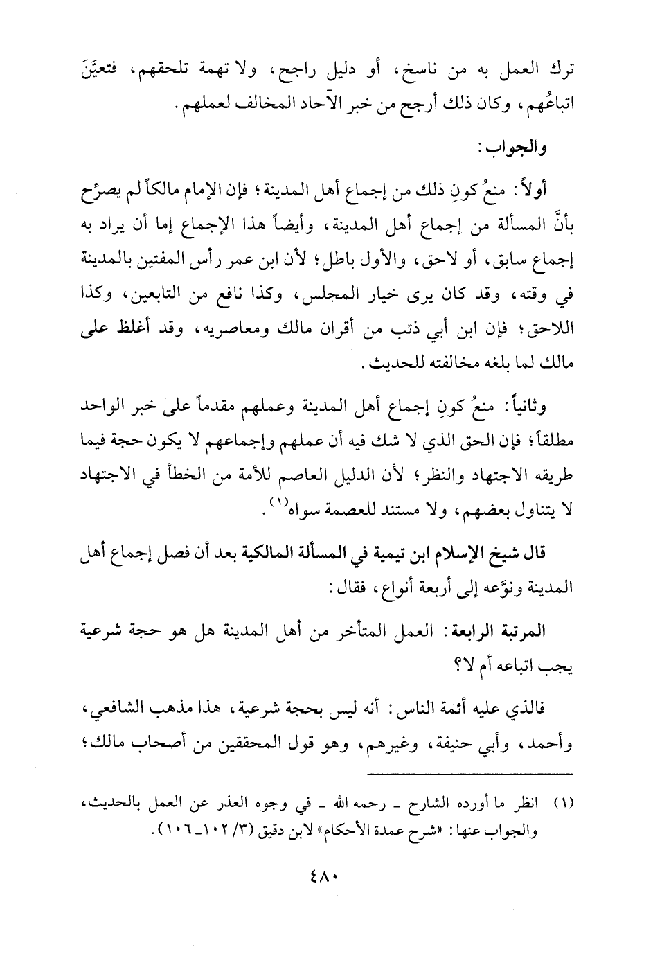 قال شيخ الإسلام ابن تيمية في المسألة المالكية بعد أن فصل إجماع أهل المدينة ونوَّعه إلى أربعة أنواع، فقال: