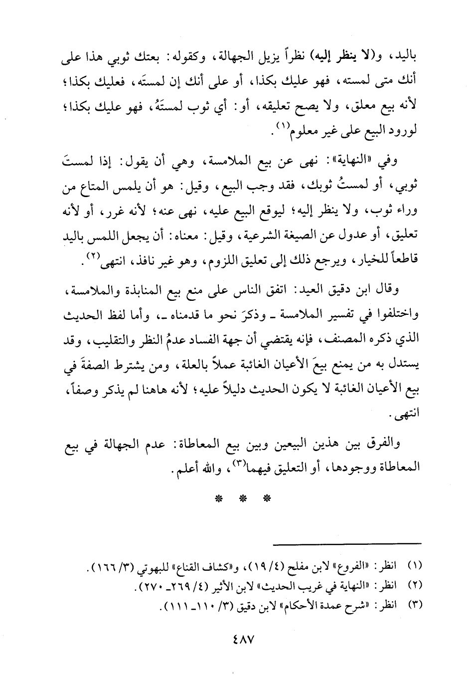 وفي "النهاية": نهى عن بيع الملامسة، وهي أن يقول: إذا لمستَ ثوبي، أو لمستُ ثوبك، فقد وجب البيع، وقيل: هو أن يلمس المتاع من وراء ثوب، ولا ينظر إليه، ليوقع البيع عليه، نهى عنه؛ لأنه غرر، أو لأنه تعليق، أو عدول عن الصيغة الشرعية، وقيل: معناه: أن يجعل اللمس باليد قاطعًا للخيار، ويرجع ذلك إلى تعليق اللزوم، وهو غير نافذ، انتهى (٢).