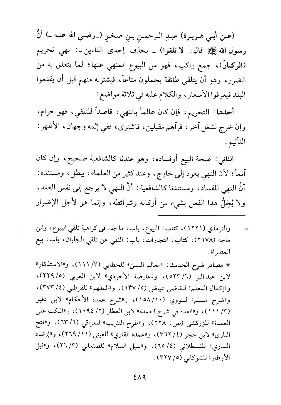 (عن أبي هريرة) عبدِ الرحمنِ بنِ صخرٍ (- رضي الله عنه -) أنَّ رسول الله - صلى الله عليه وسلم - قال: لا تلقوا) -بحذف إحدى التاءين-: نهي تحريم (الركبانَ)، جمع راكب، فهو من البيوع المنهي عنها، لما يتعلق به من الضرر، وهو أن يتلقى طائفة يحملون متاعًا، فيشتريه منهم قبل أن يقدموا البلد فيعرفوا الأسعار، والكلام عليه في ثلاثة مواضع: